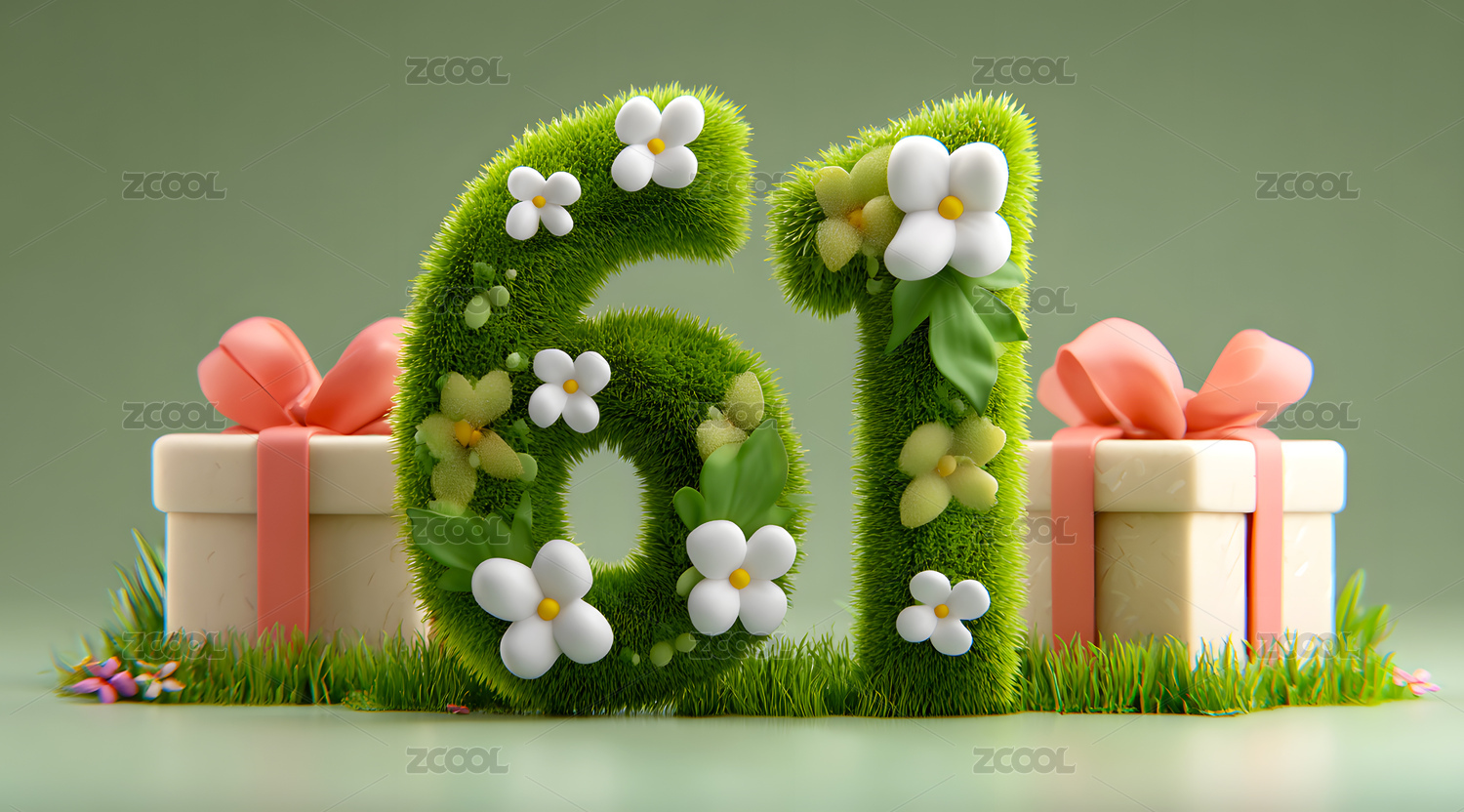 冬季冰雪中绿色植物冰雕数字5立体3D插画