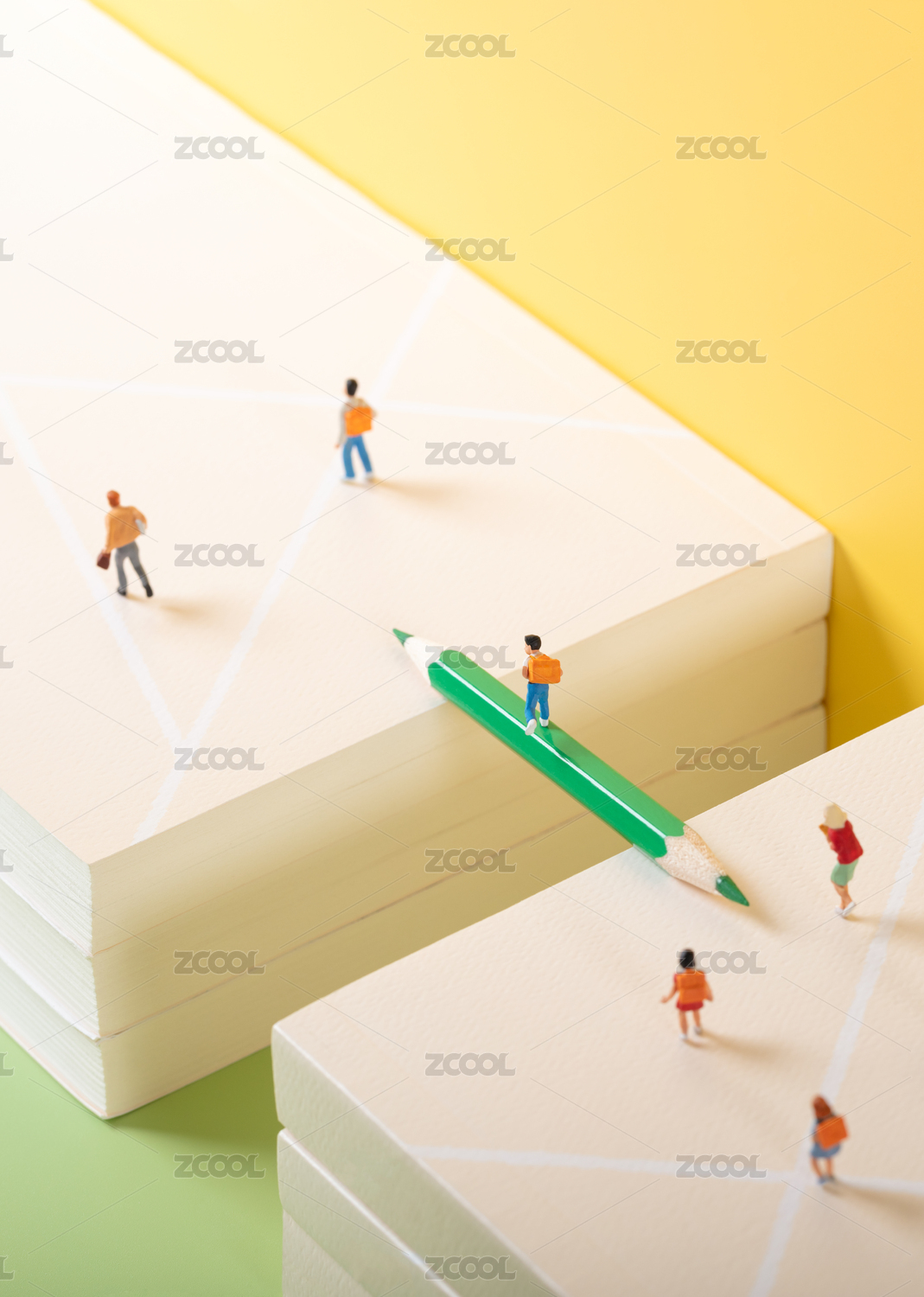 被铅笔围困在墙脚的上学儿童微缩创意图
