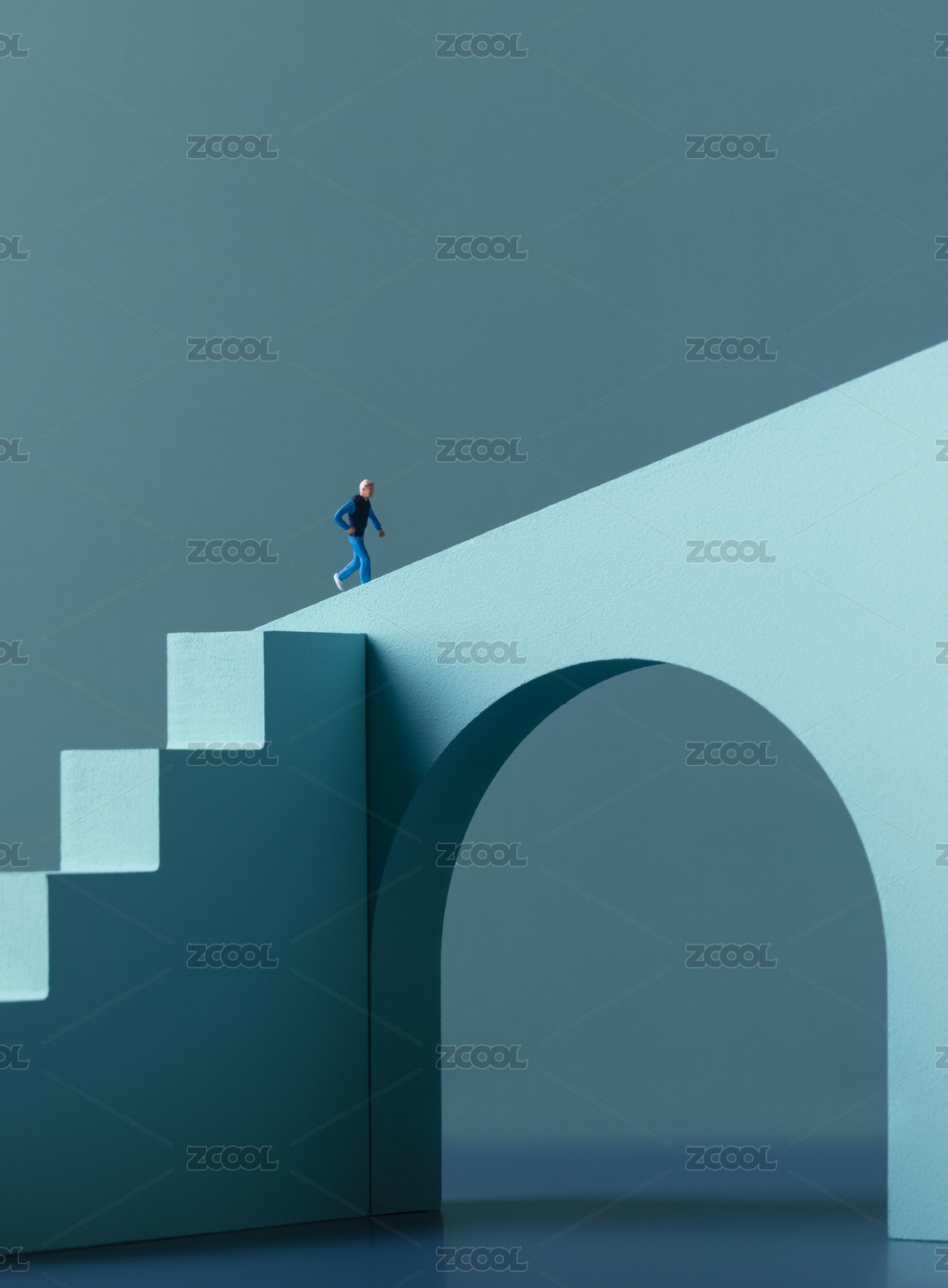 马卡龙色几何体抽象建筑阶梯拱门上奔跑