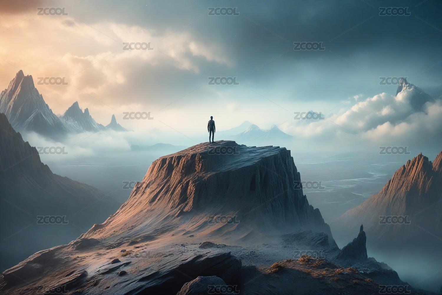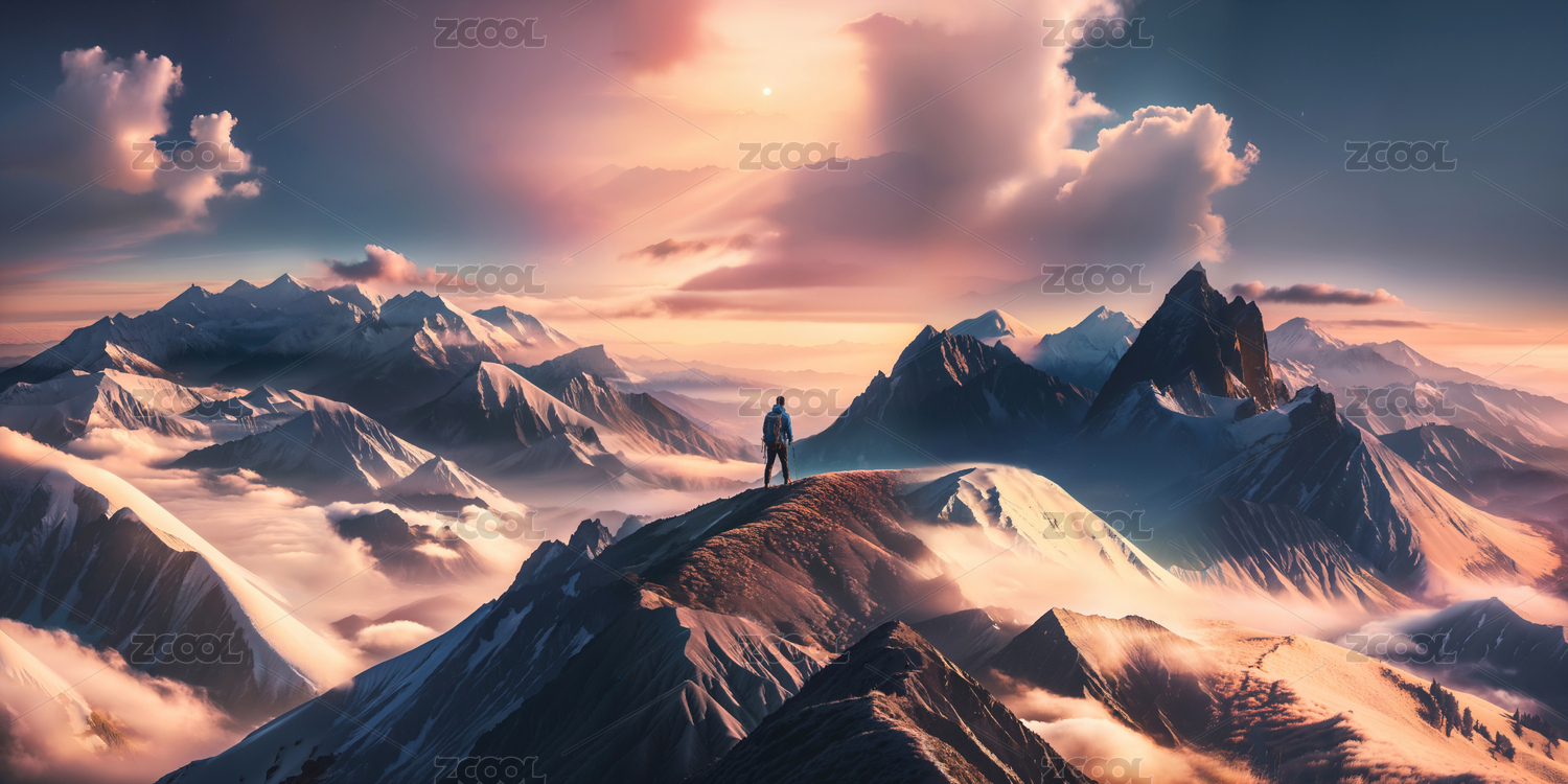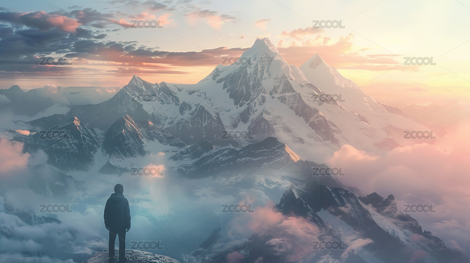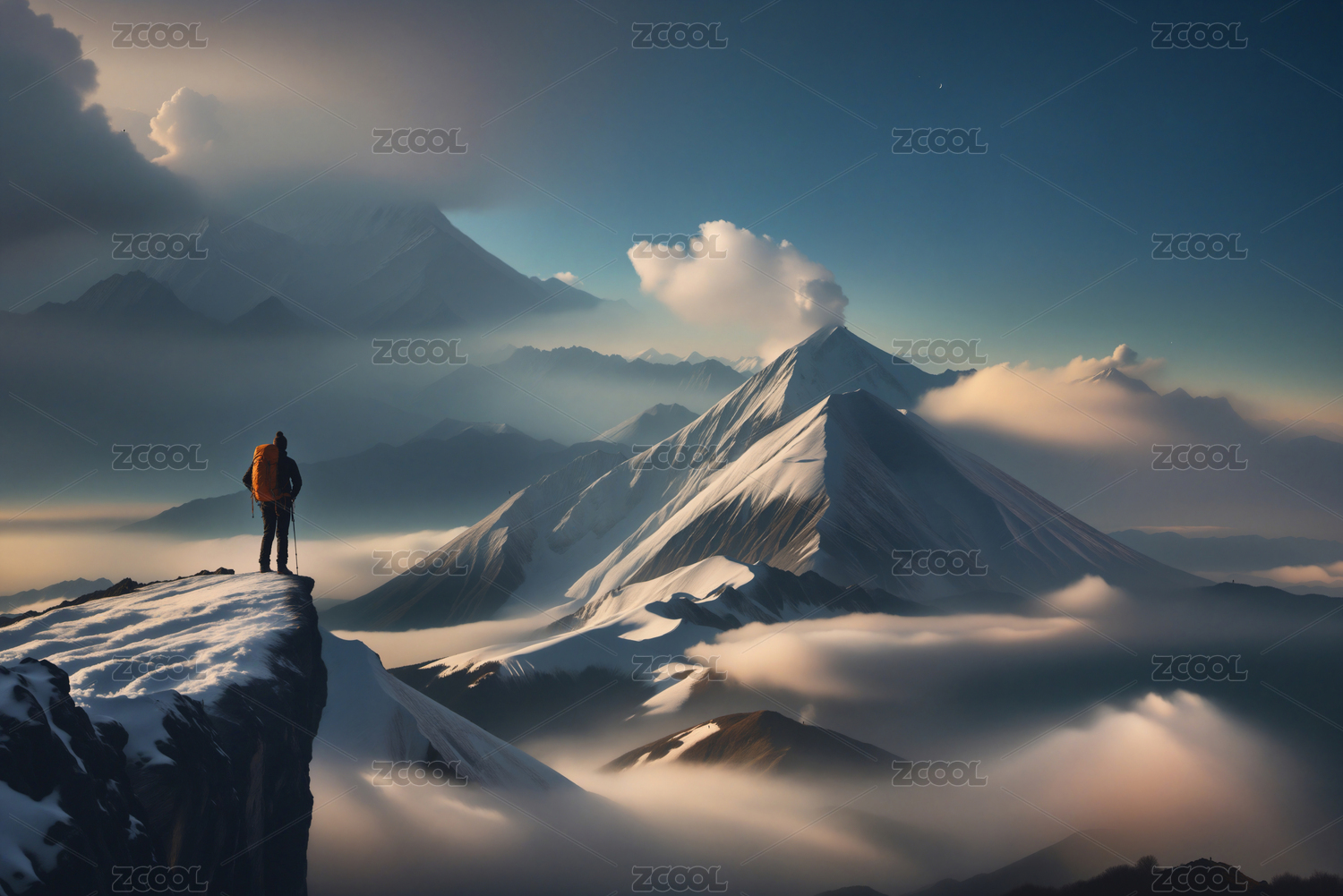 雪山,云雾,山顶,人物,孤独,探索,自然,风景,天空,光线