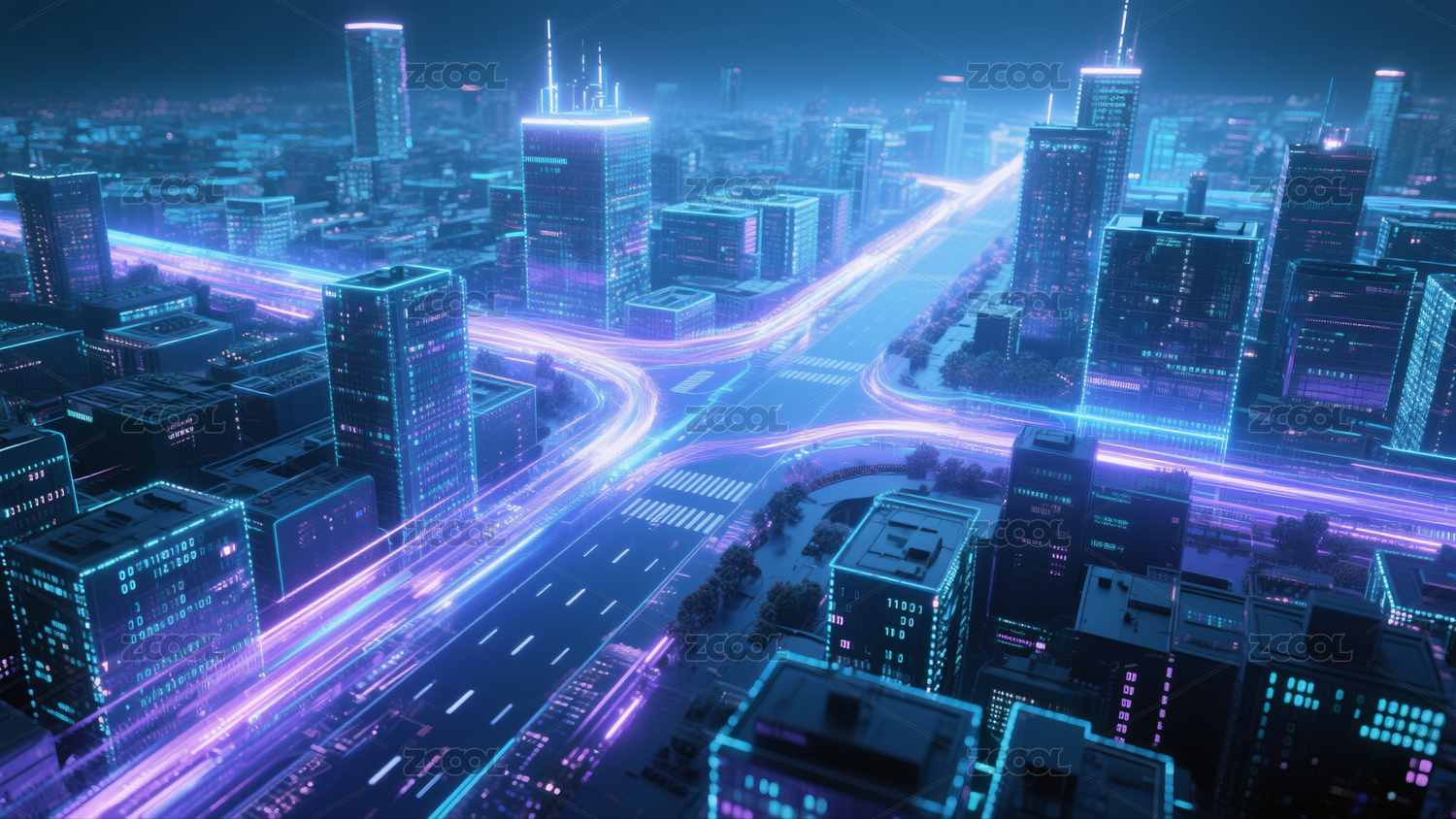 夜晚科技悬浮的现代城市高架路3D立体插画