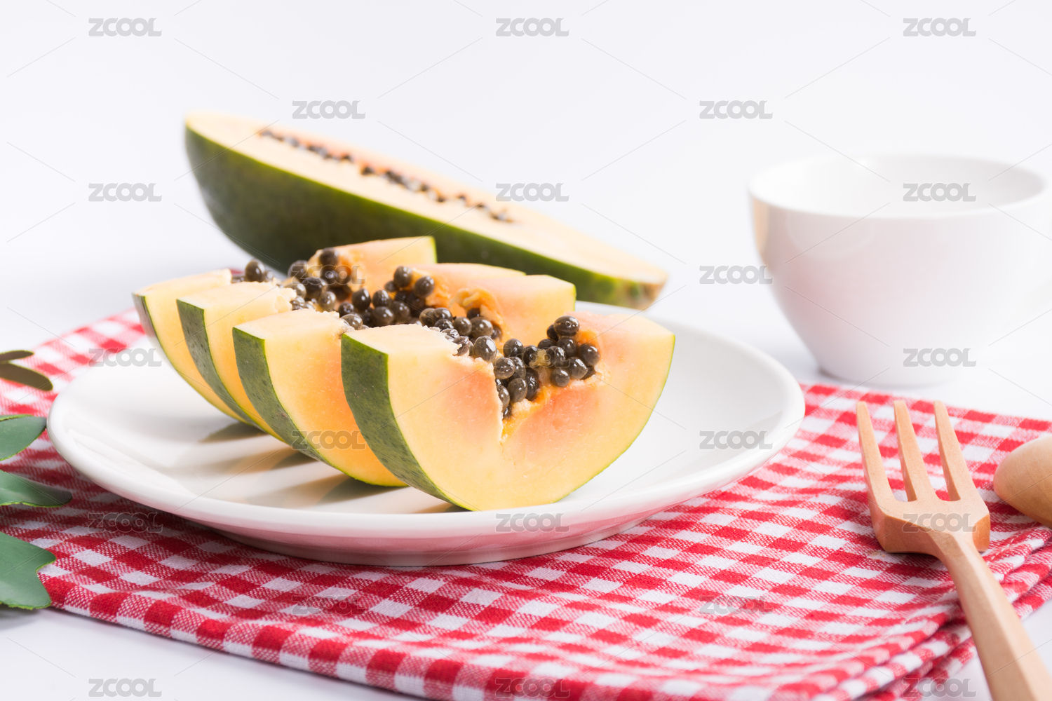 盘子上切好整齐摆放的新鲜木瓜果肉