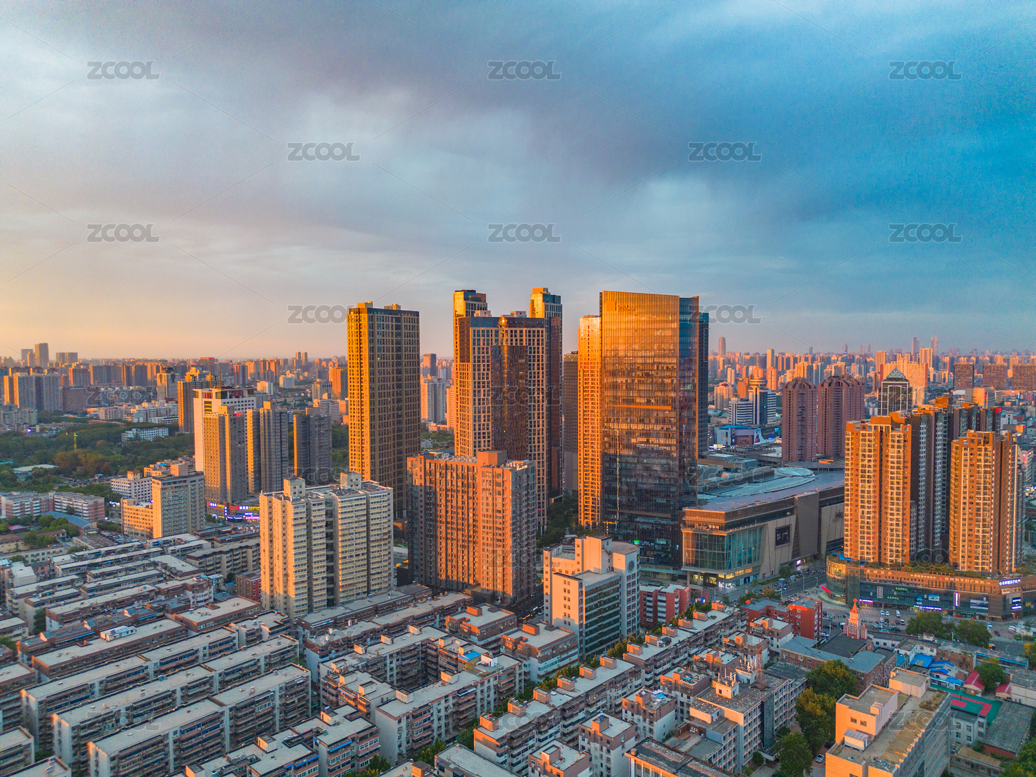 夕阳下的河南郑州二七区城市风光航拍