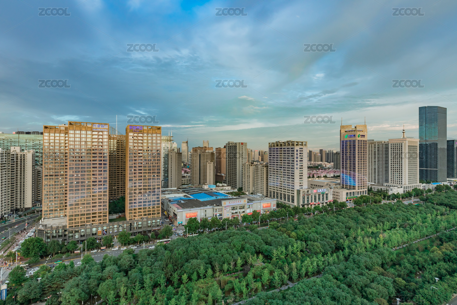 夏天多云天气下的西安高新区锦业路CBD摩