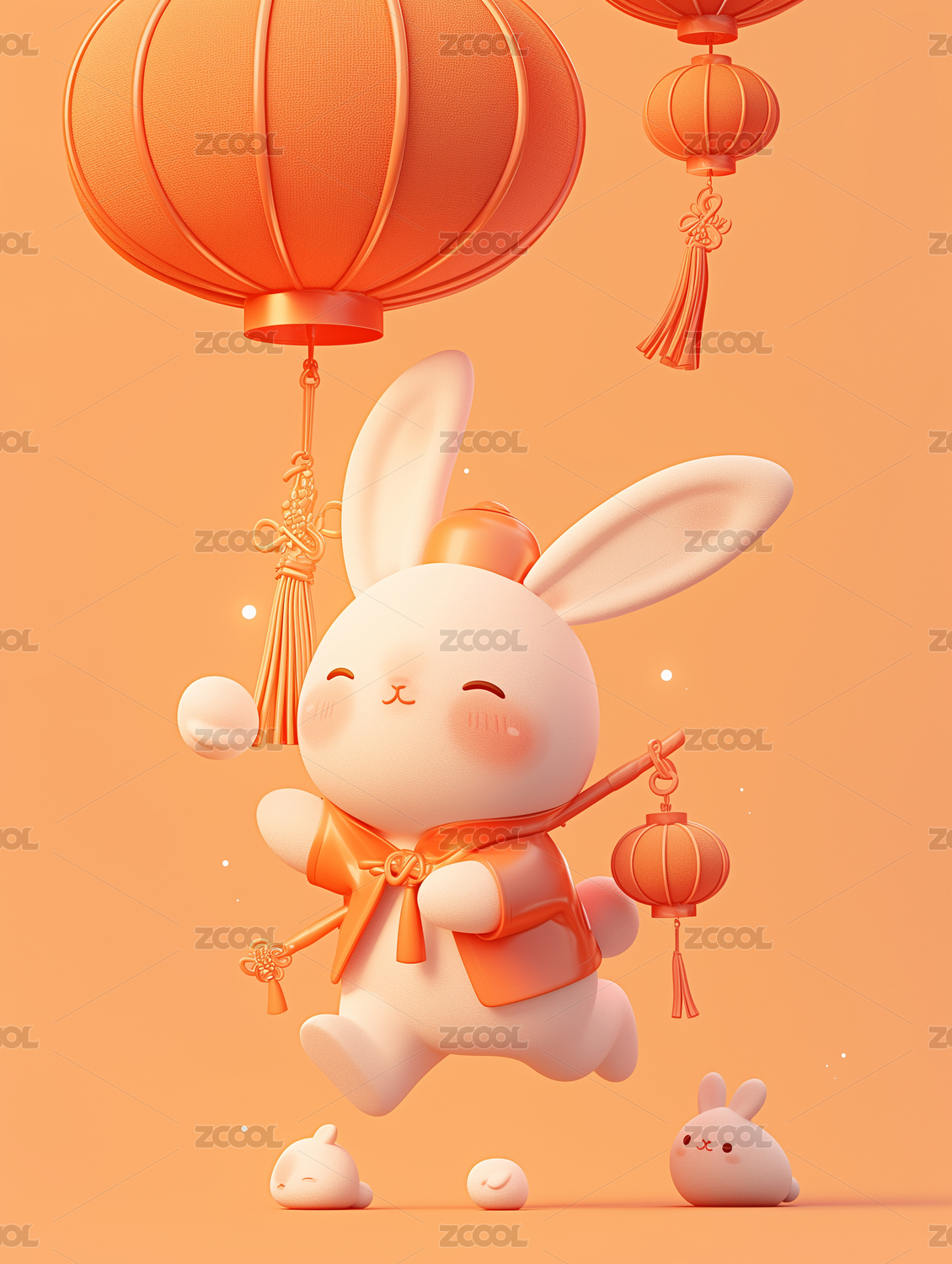 玉兔,月兔,可爱,AIGC202403,插画,黄色,扁平插画,灯笼
