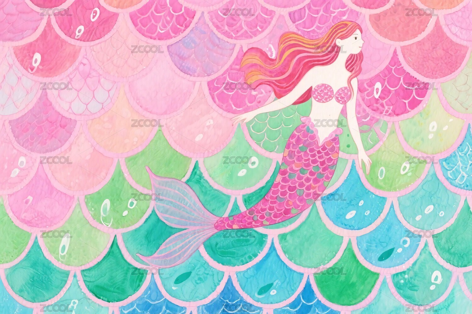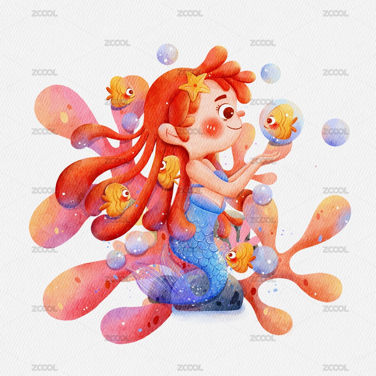 美人鱼与泡泡海底猴子鱼群珊瑚礁石多彩插画