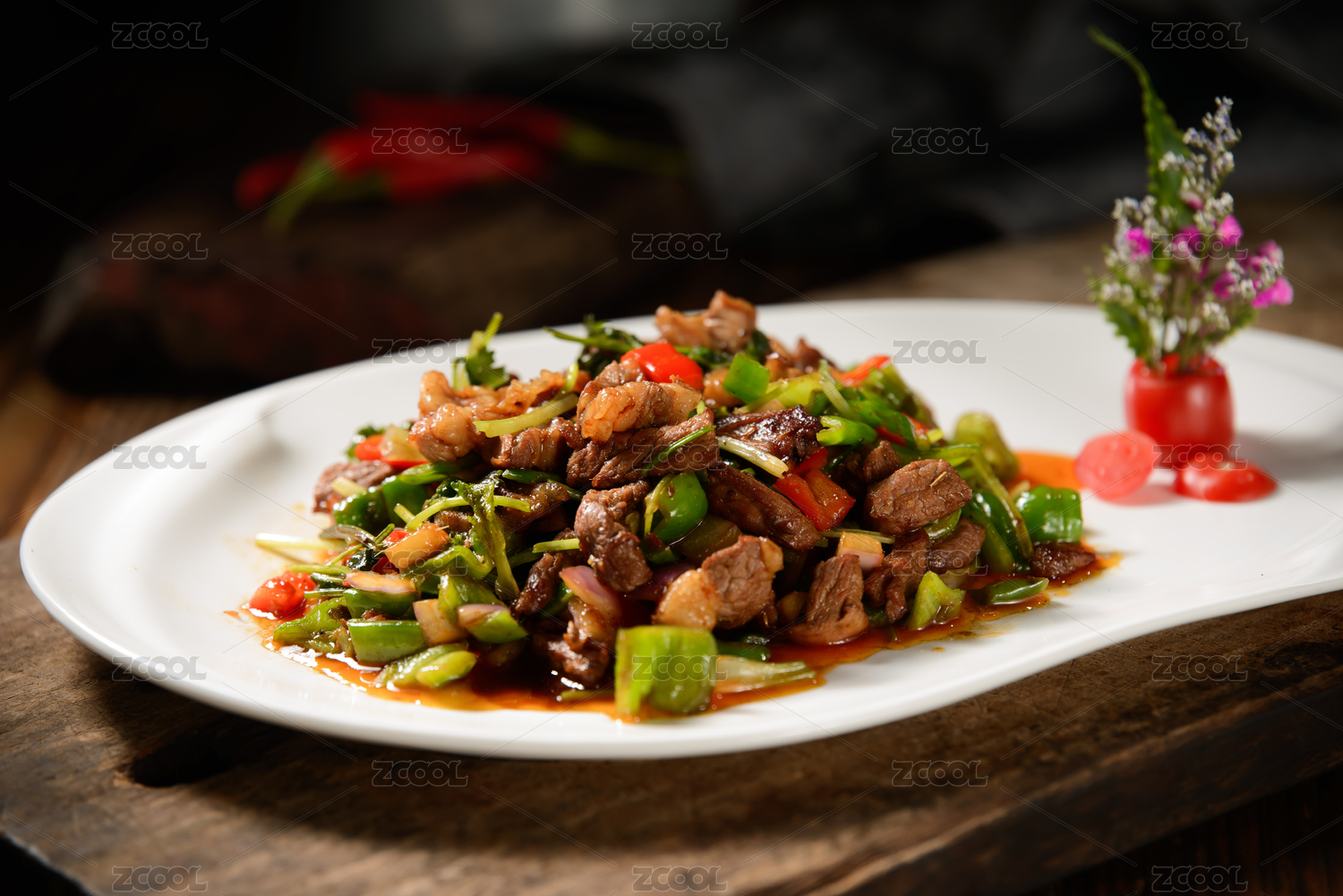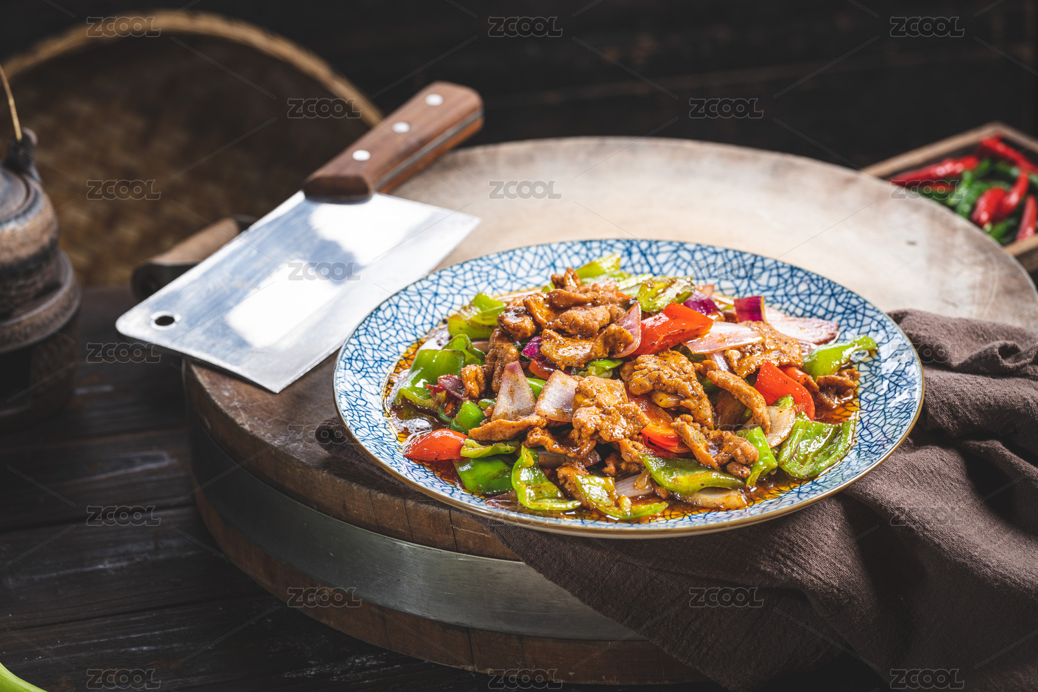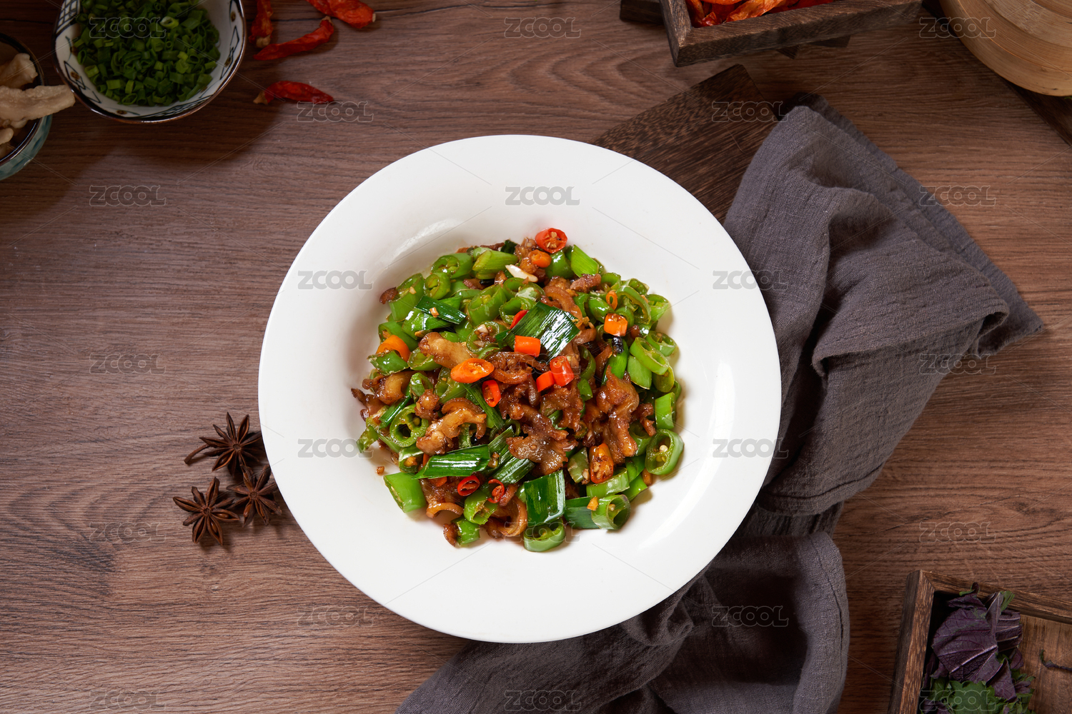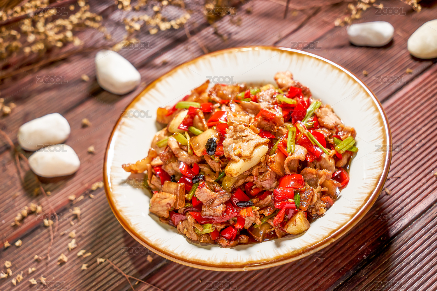中国传统农家菜辣椒炒肉盛放在白瓷盘内