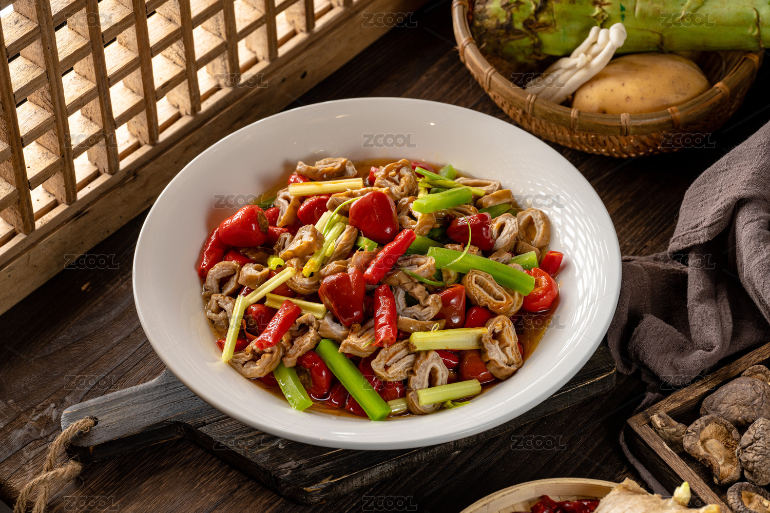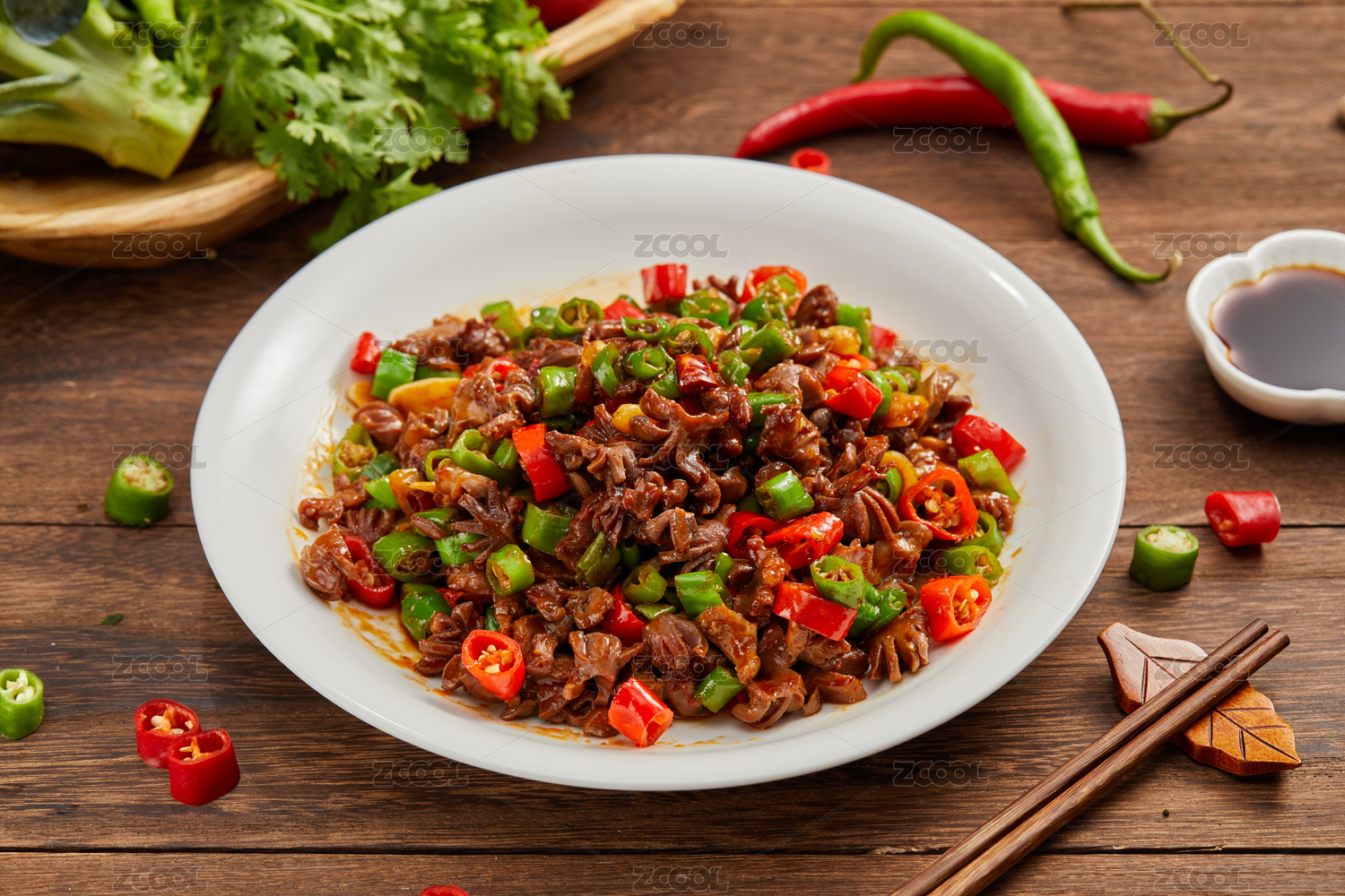 木桌面上白色盘子上装着一盘麻辣鸡胗