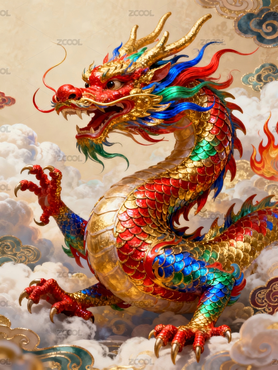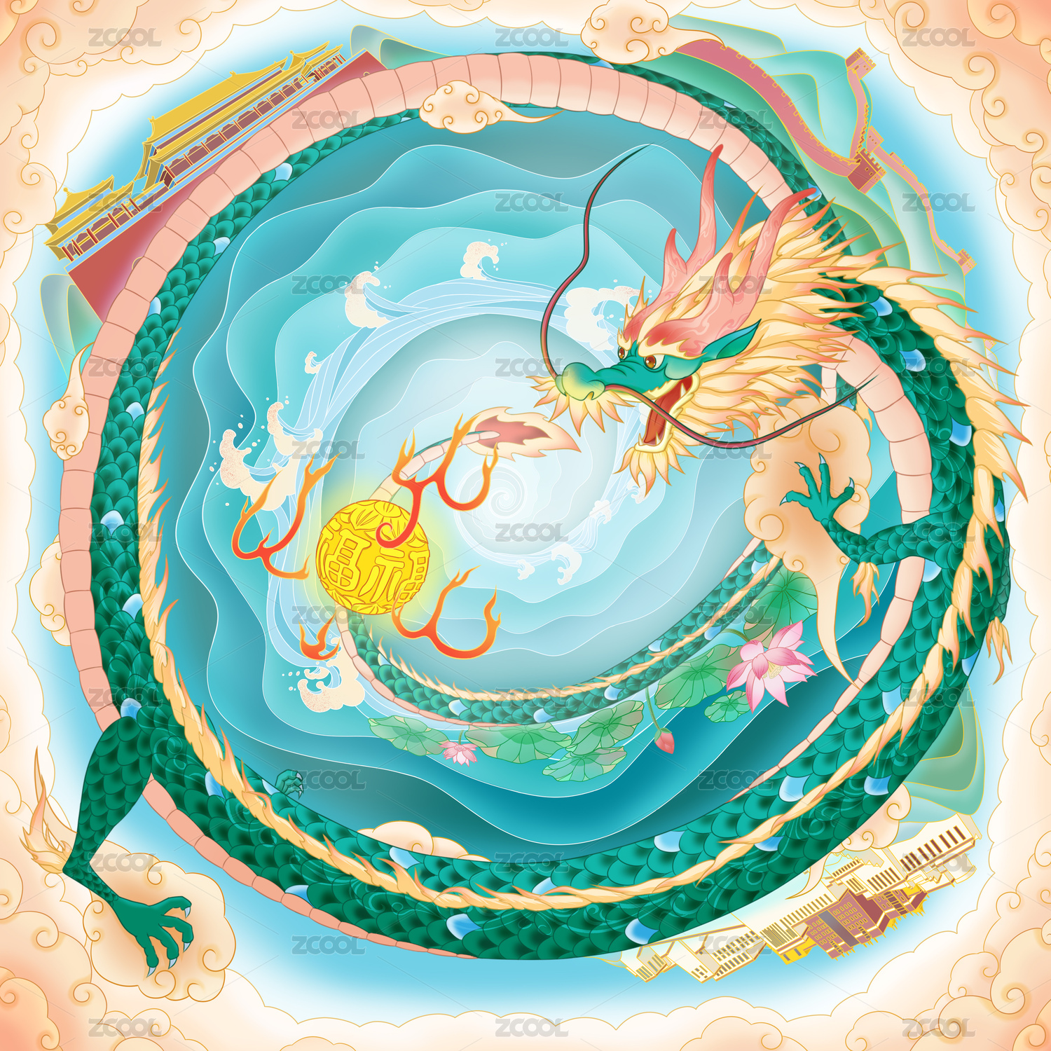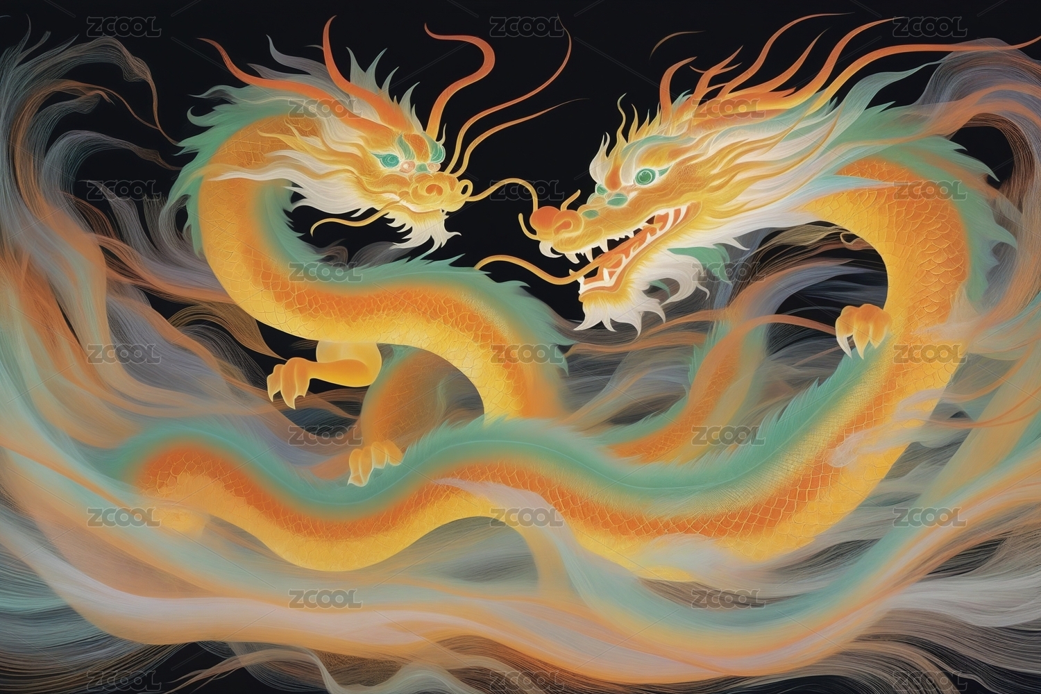 身缠祥云的龙和凤凰飞翔在群山大海和旭日上