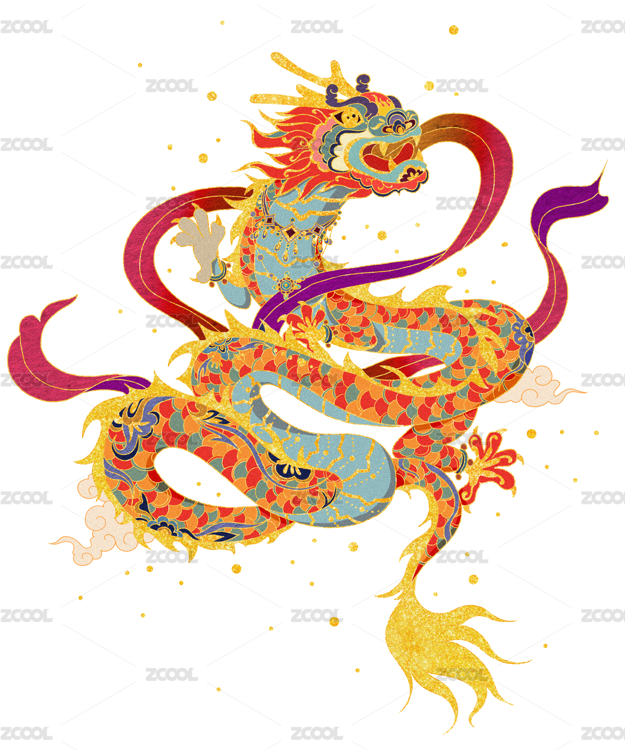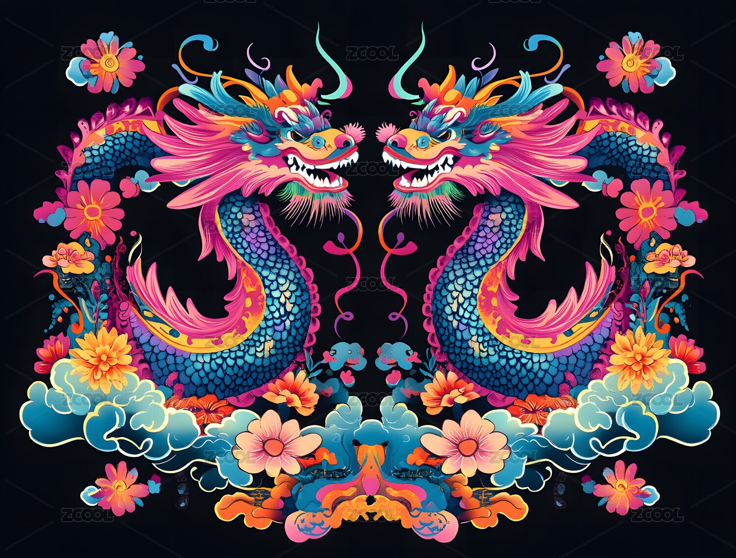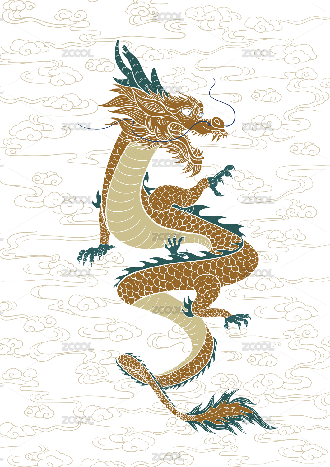 身缠祥云的龙和凤凰飞翔在群山大海和旭日上