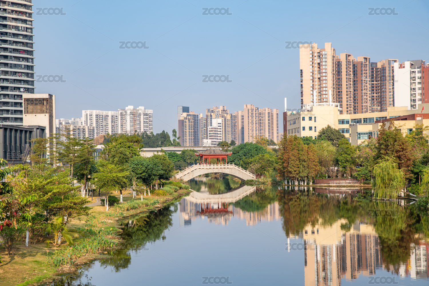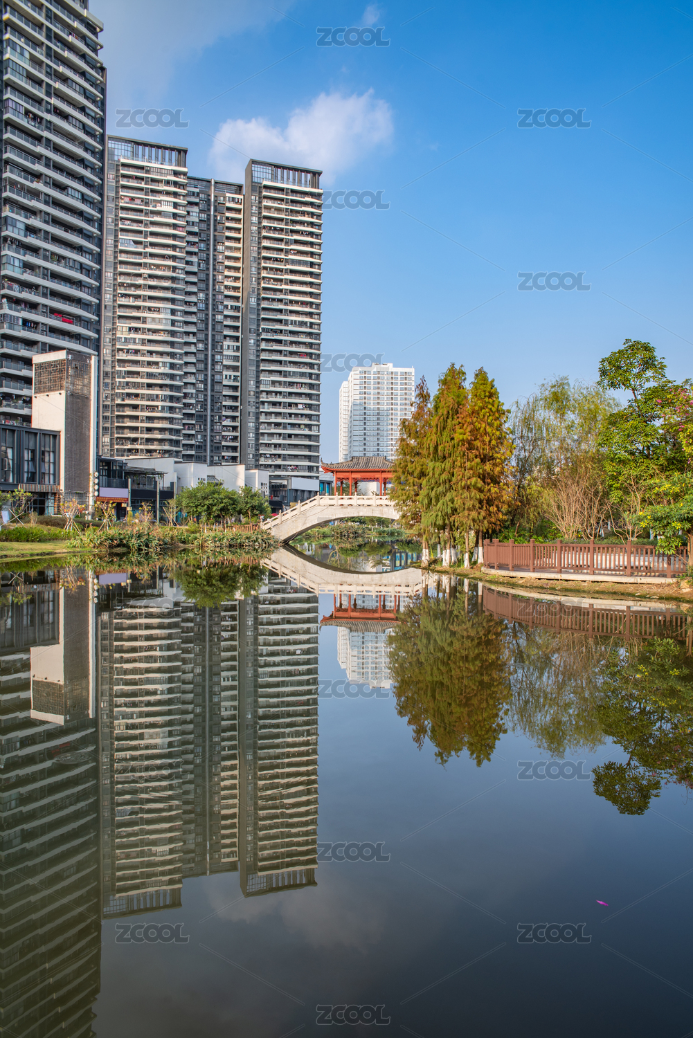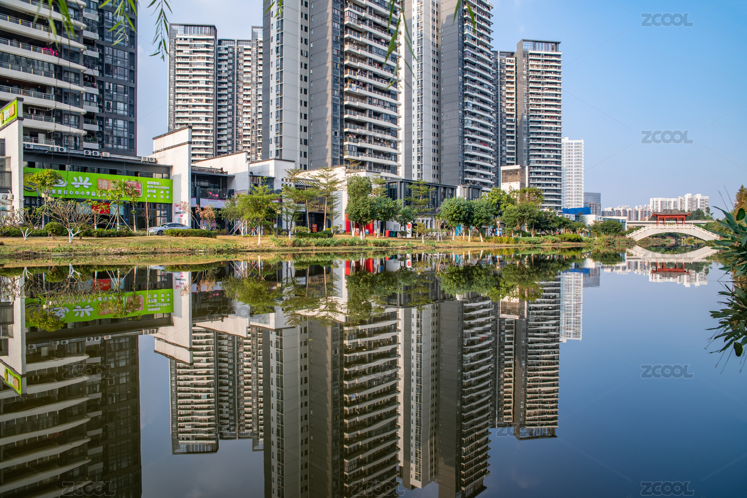 美丽的河畔水岸高层住宅小区环境背景素材