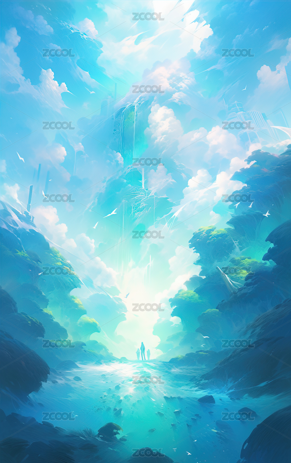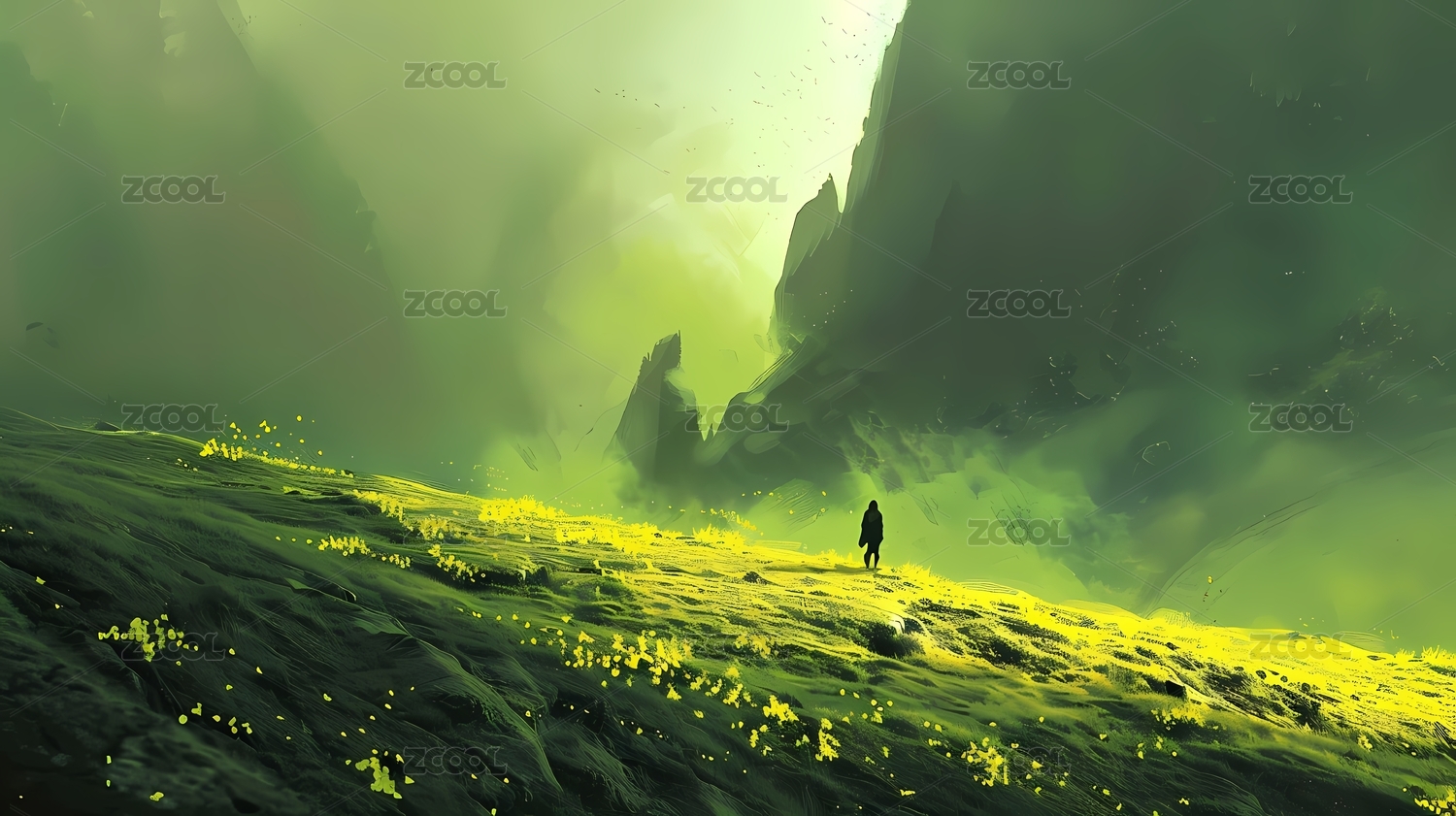 绿色山景人物场景海报背景