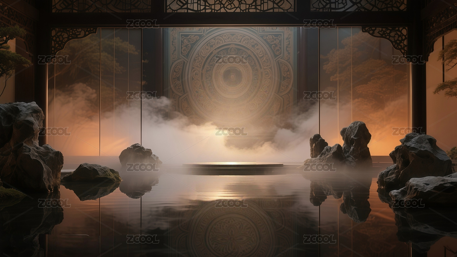 东方禅意水面岩石倒影屏风