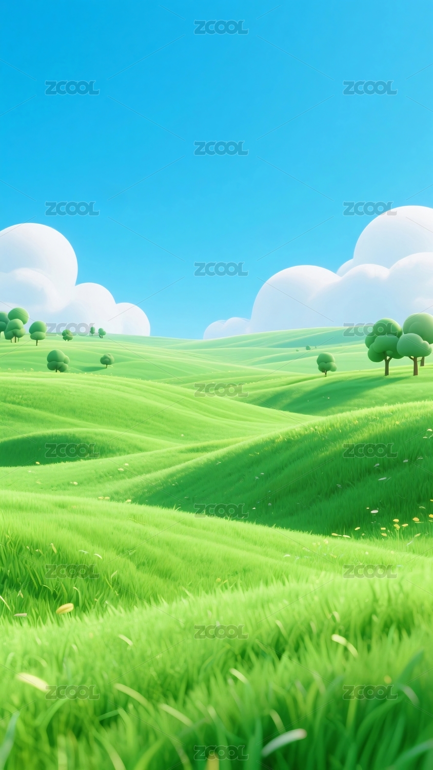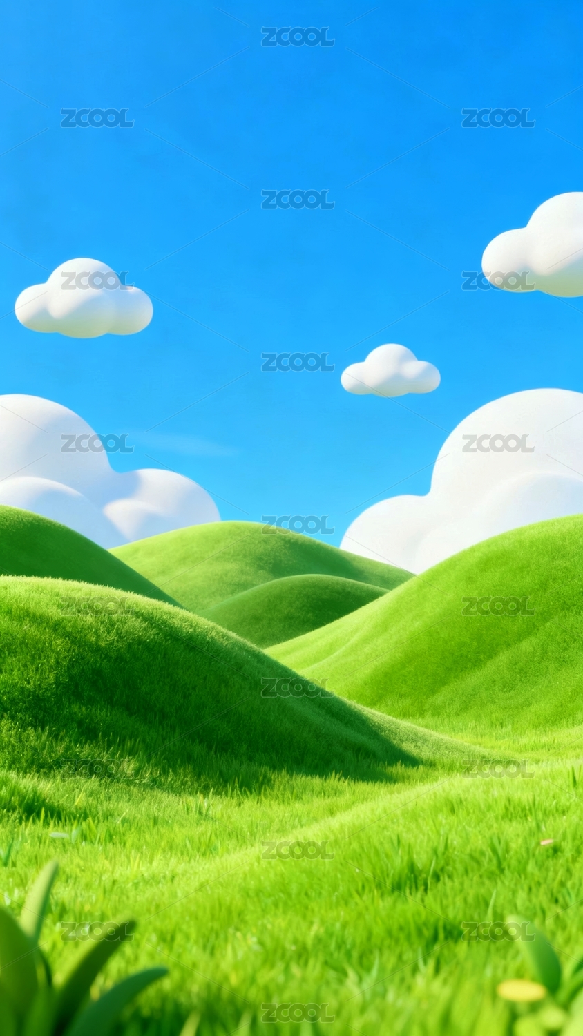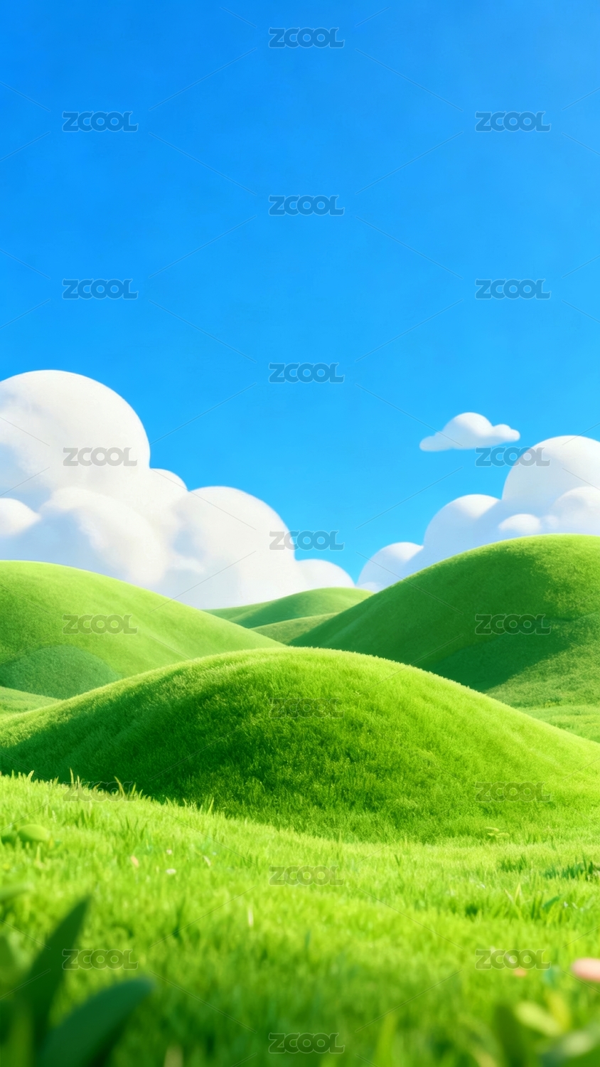 青翠草地蓝天白云场景