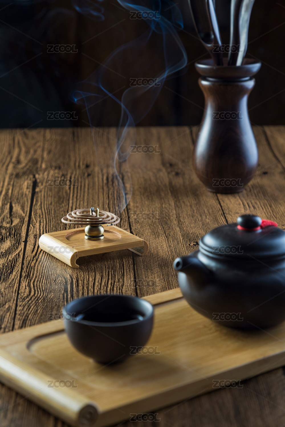 陶瓷茶具和袅袅飘散的沉香烟雾