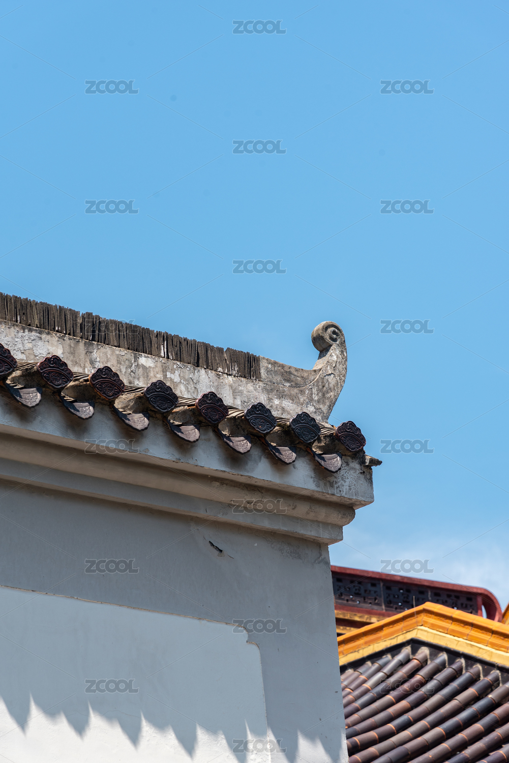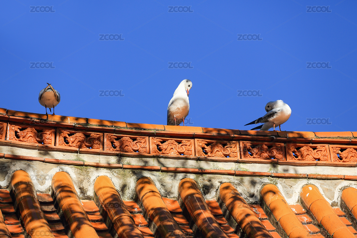 站在马头墙上整理自己羽毛的鸽子