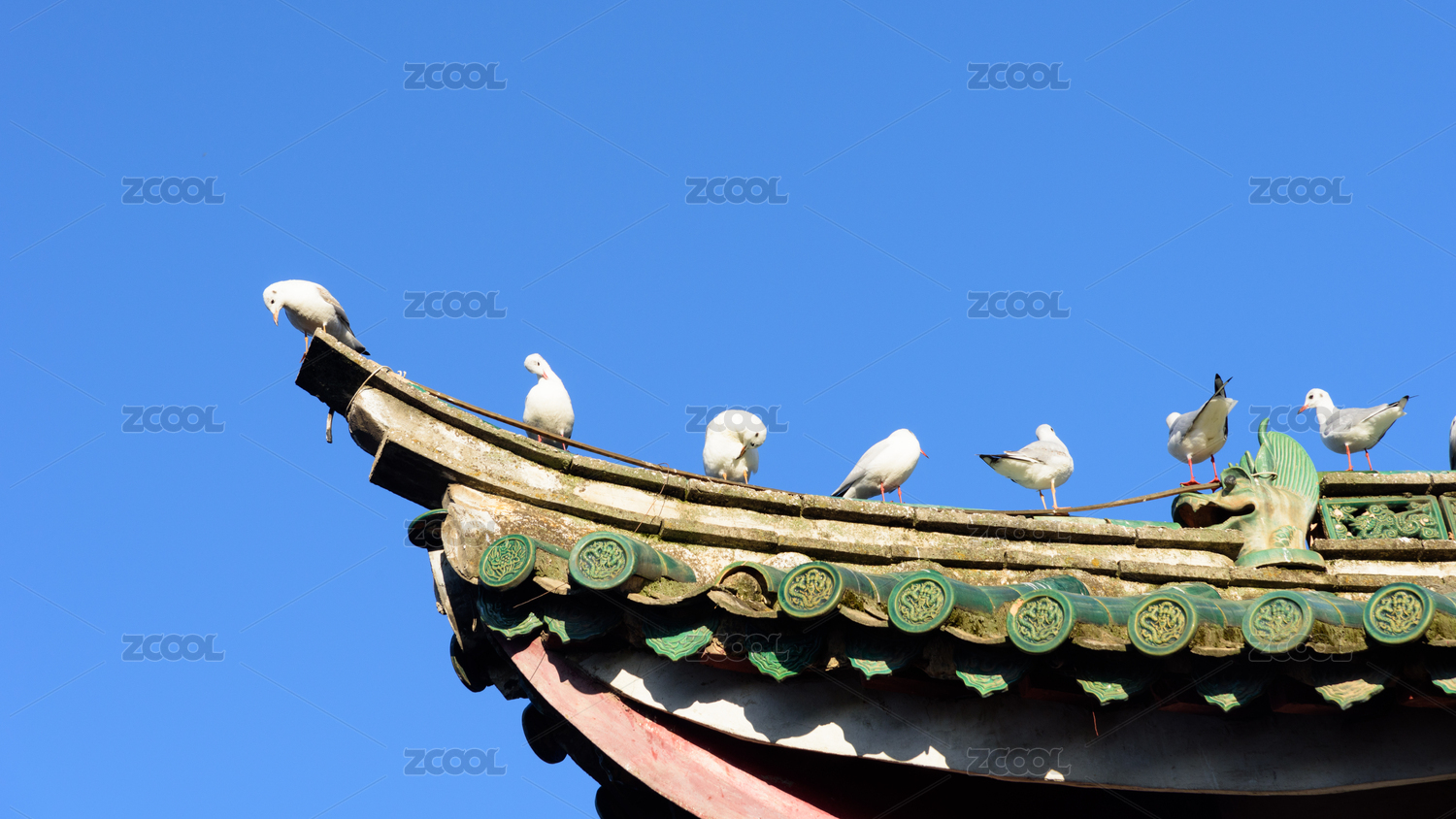 中式建筑屋檐上的一群鸽子