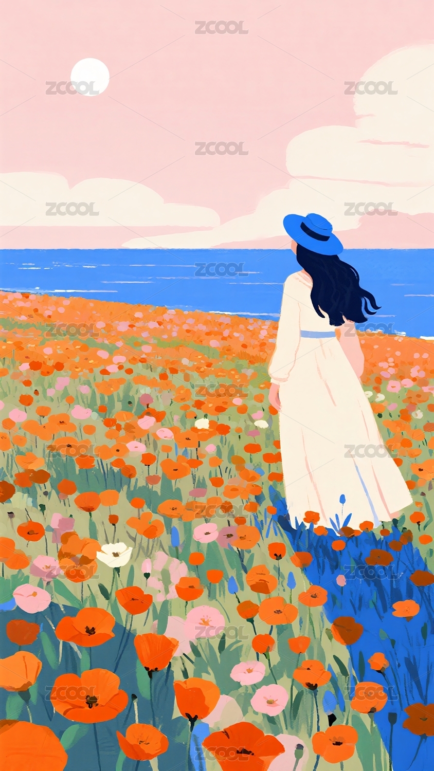 唯美秋天暖色调女孩在黄色雏菊中散步背景