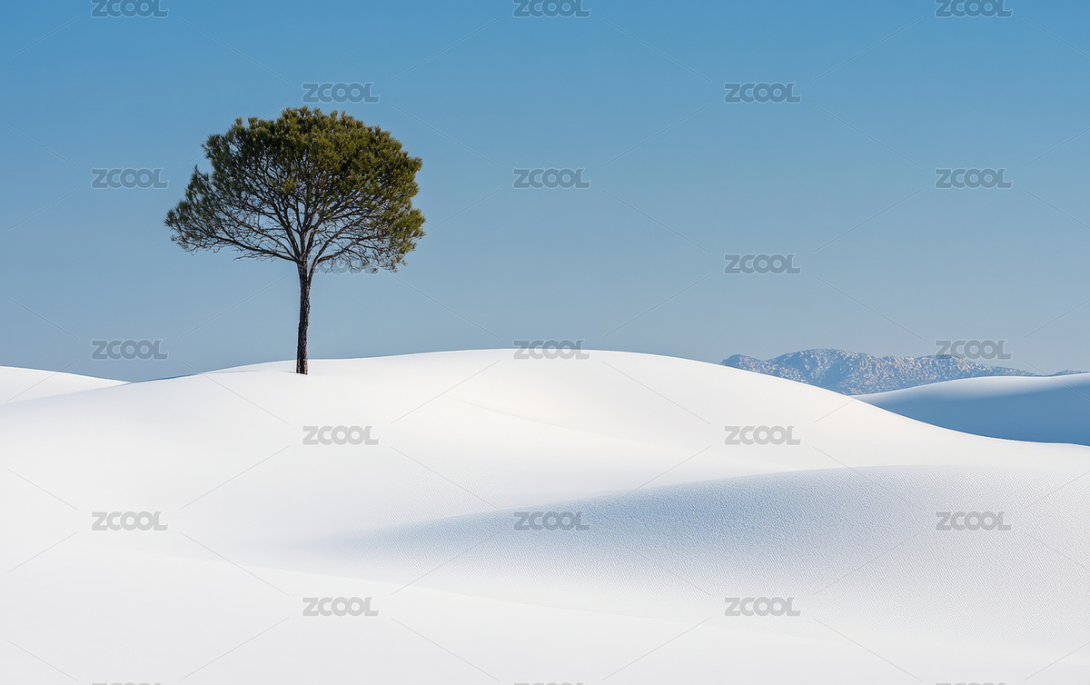 雪原孤树立于坡顶简约静谧风景