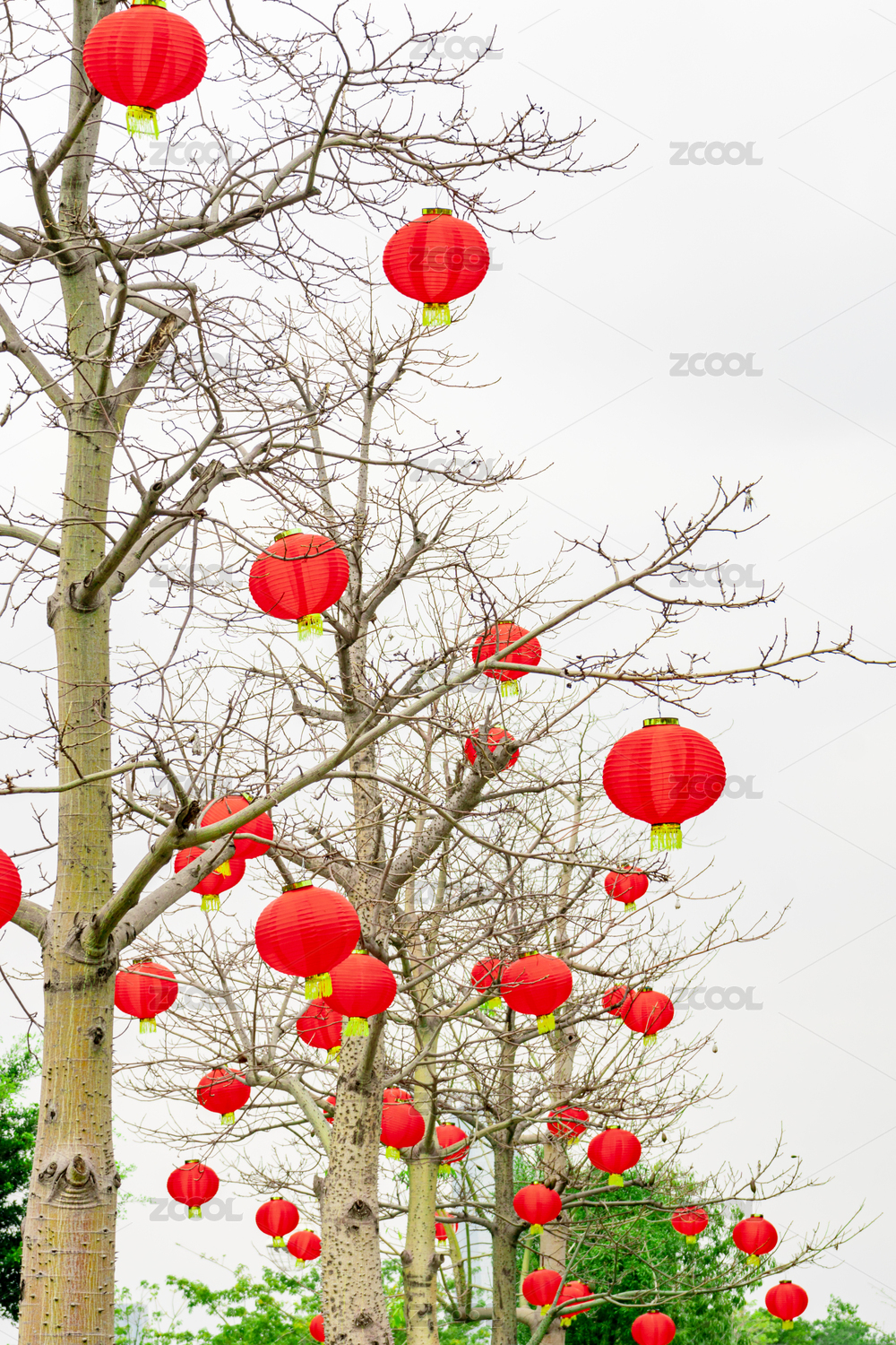 绿色大树上挂着红灯笼