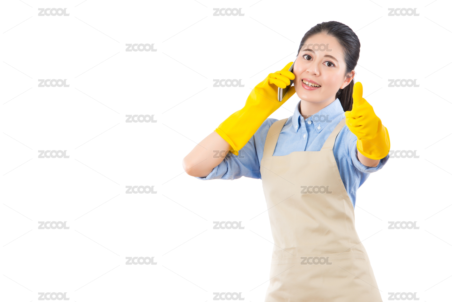 竖起大拇指审批,现在要呼吁好,最专业的家居清洁服务。隔绝在白色背景。混血亚洲的中国模式。