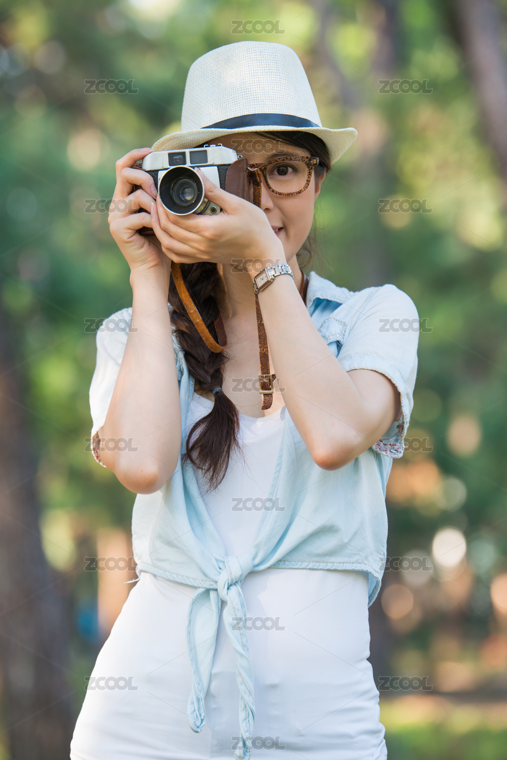 年轻漂亮的女孩用相机复古,户外旅行