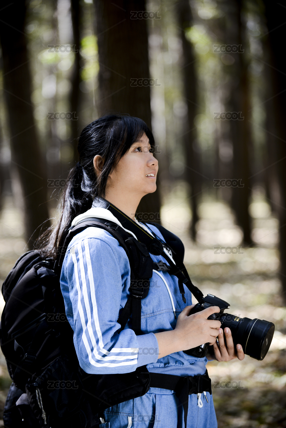 背着背包手持相机的女孩