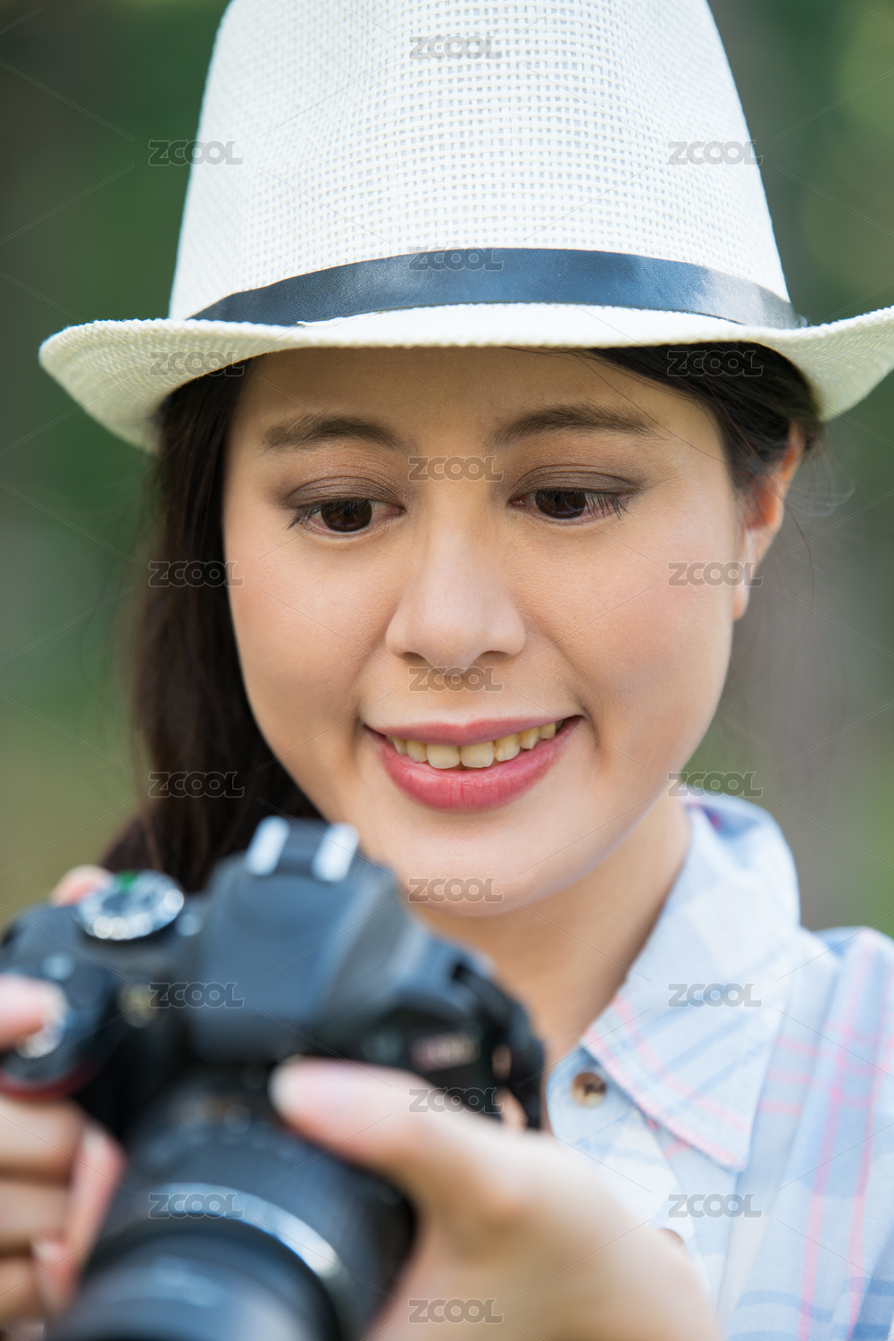 美丽的亚洲女孩的数码相机拍摄的微笑,户外旅行