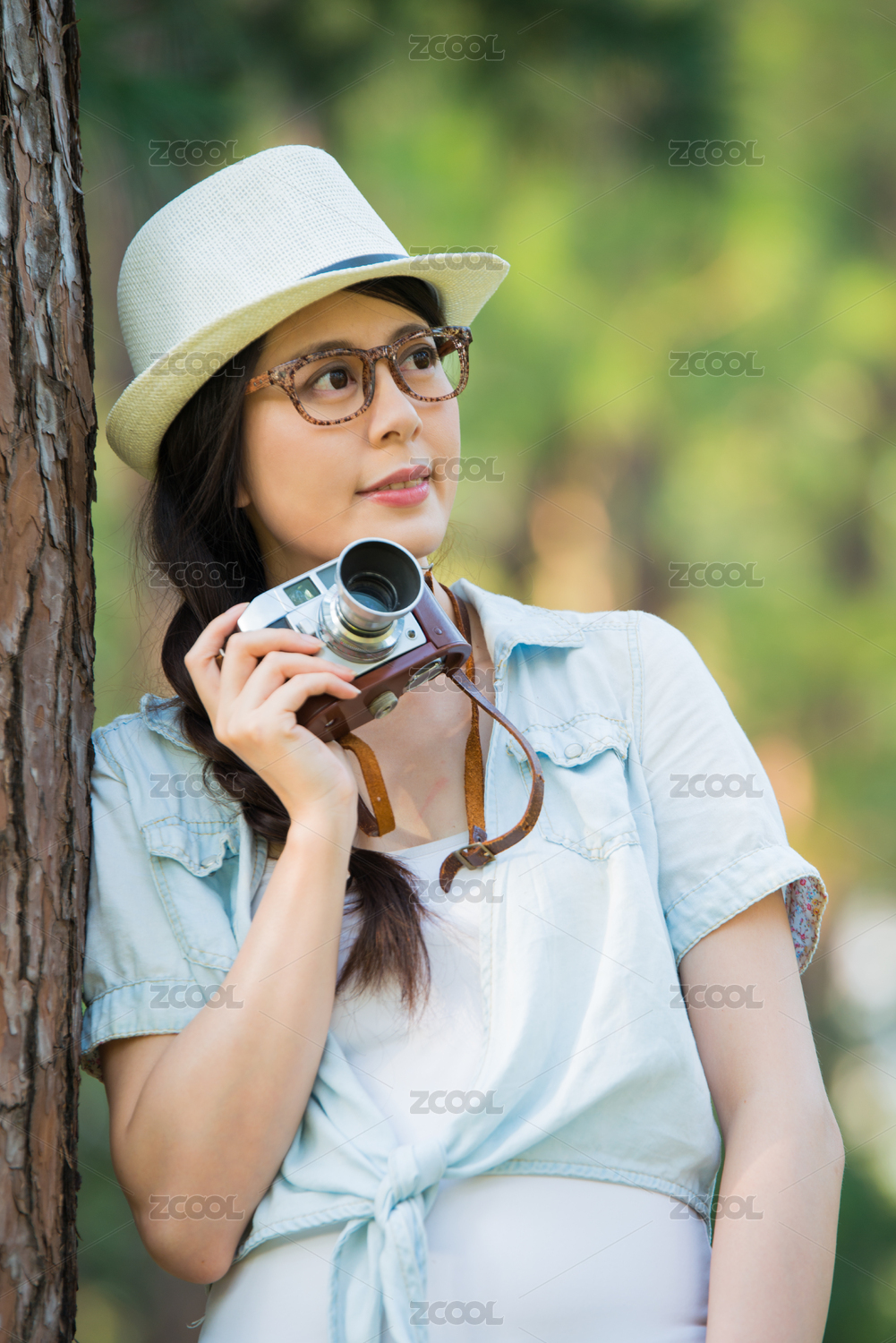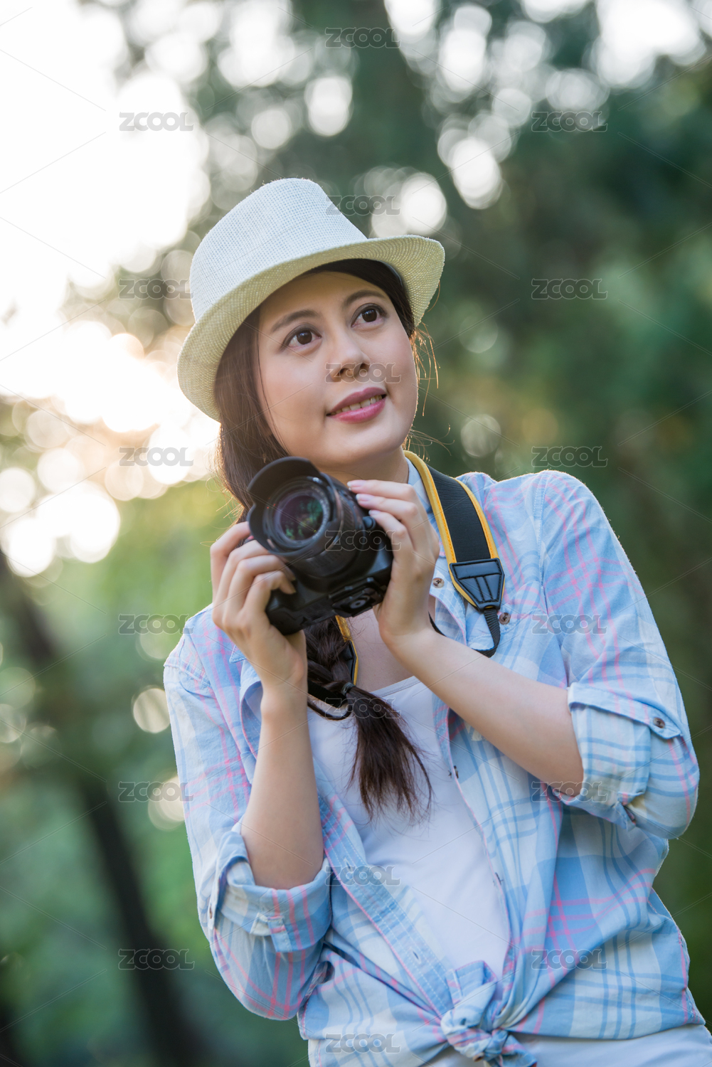 手持相机背着背包的美女看着远方