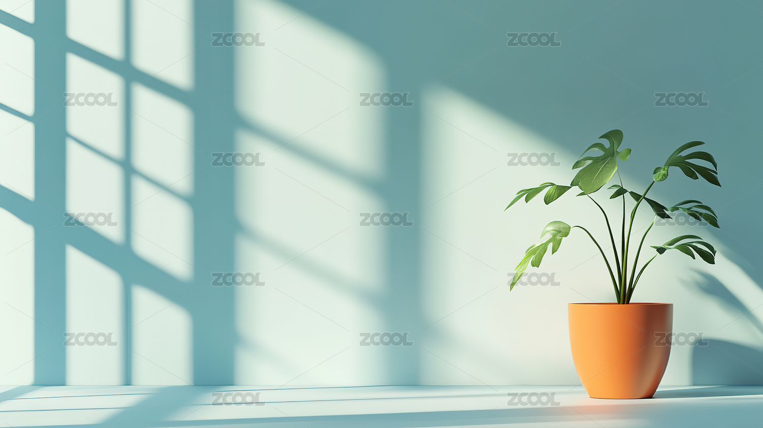 蓝墙绿植阳光洒照室内场景