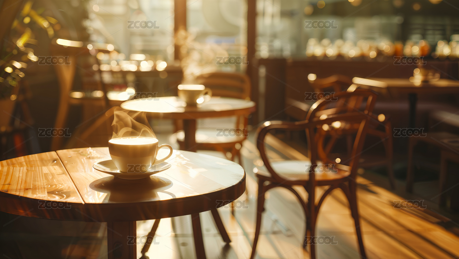 早晨阳光照进咖啡厅桌面上冒热气的咖啡