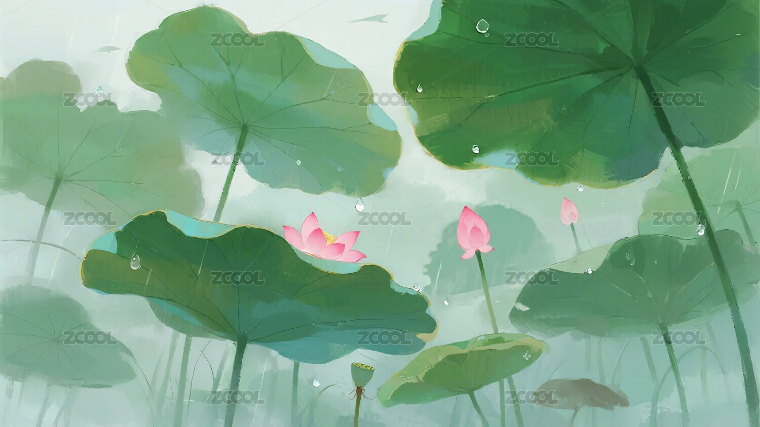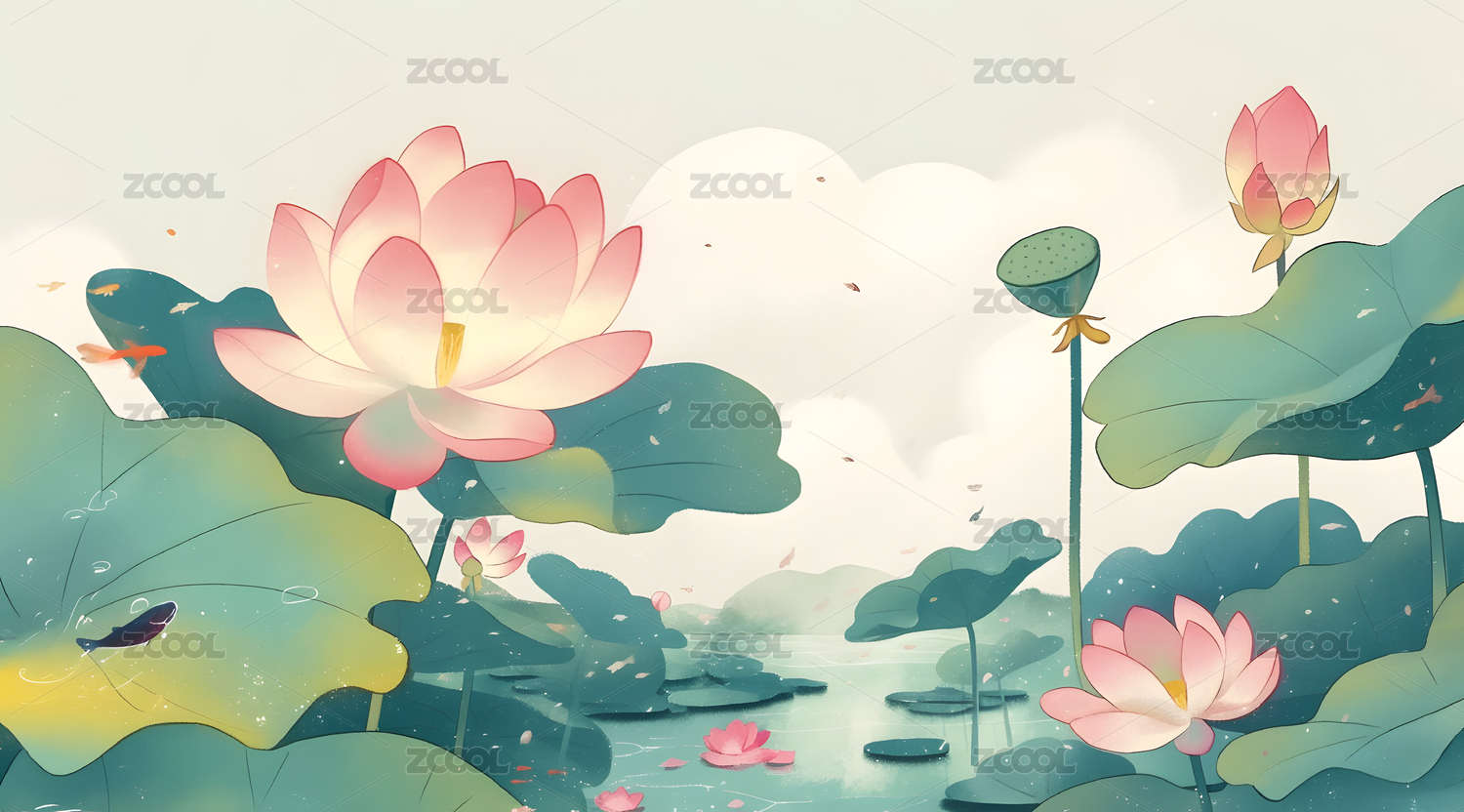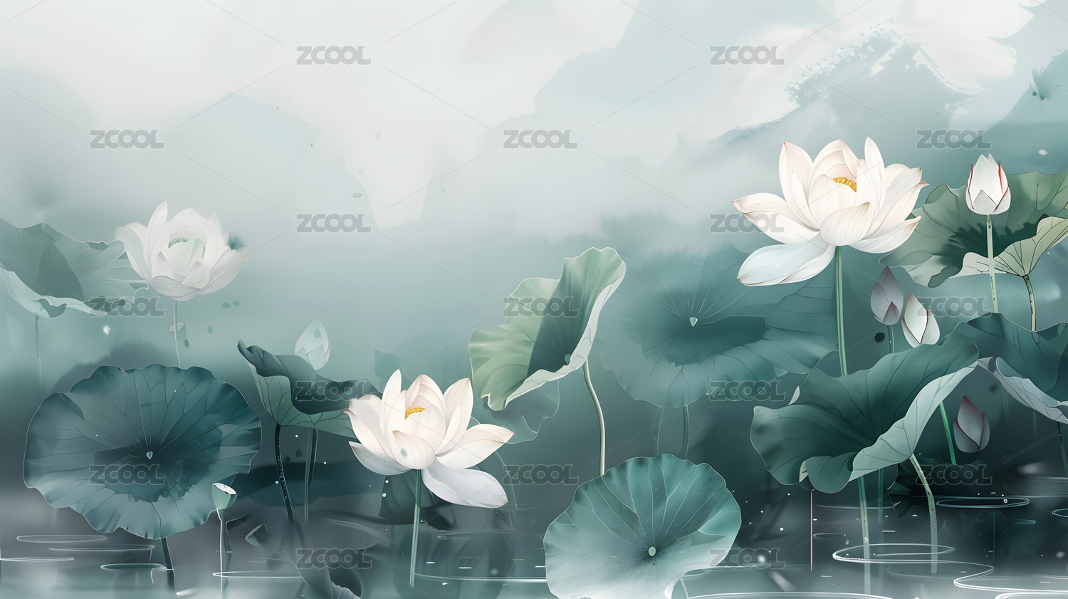 中国风荷花荷叶淡彩水墨插画壁纸背景