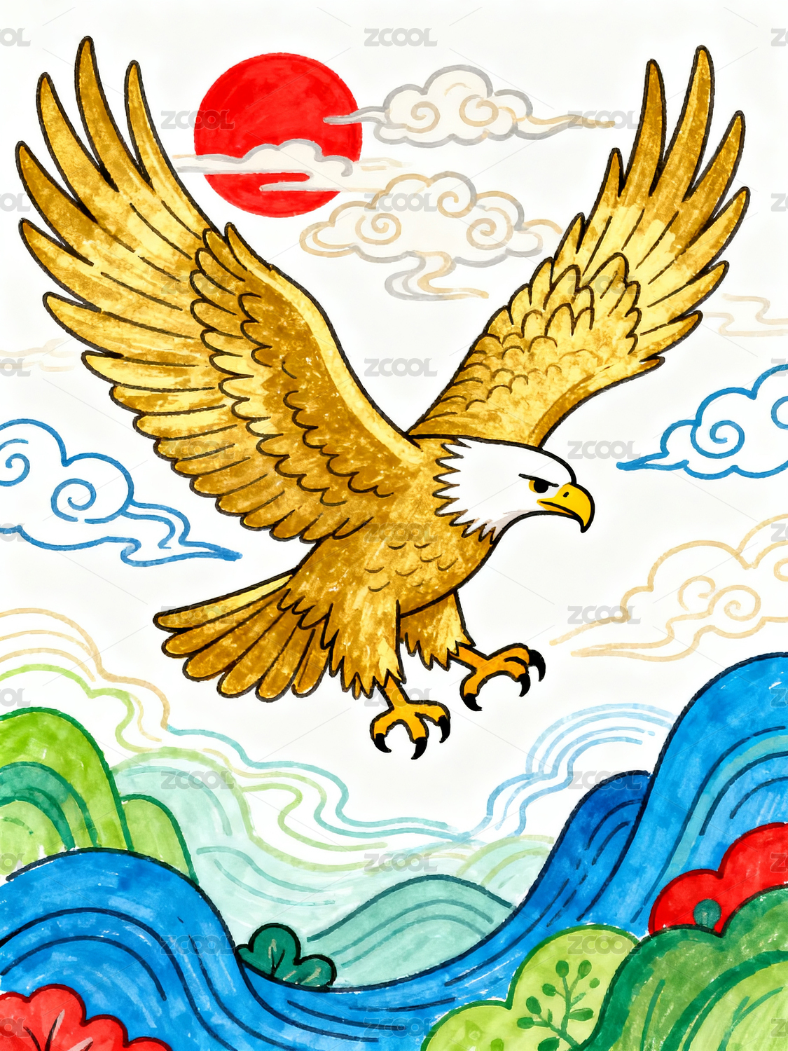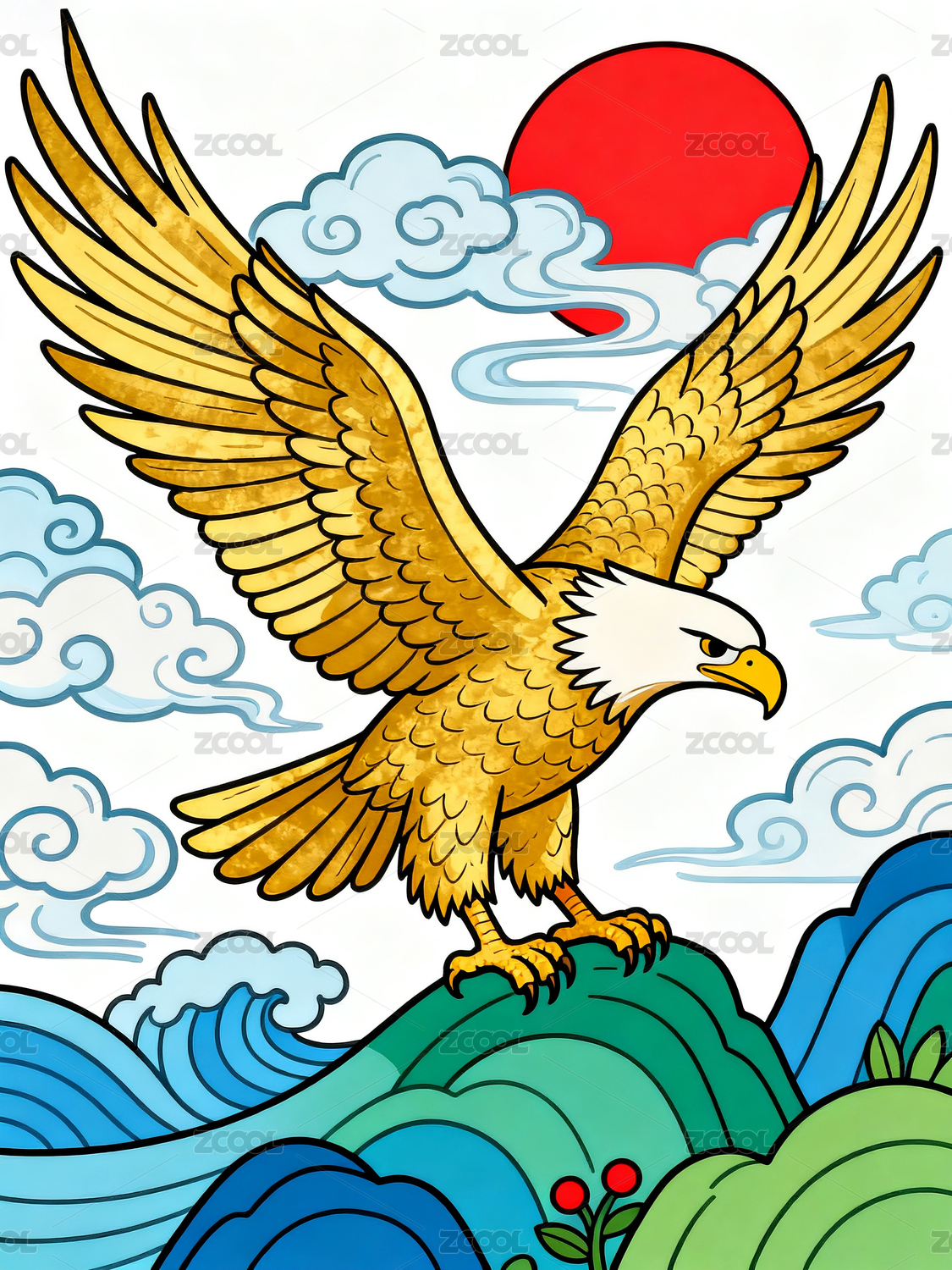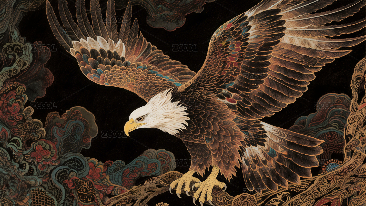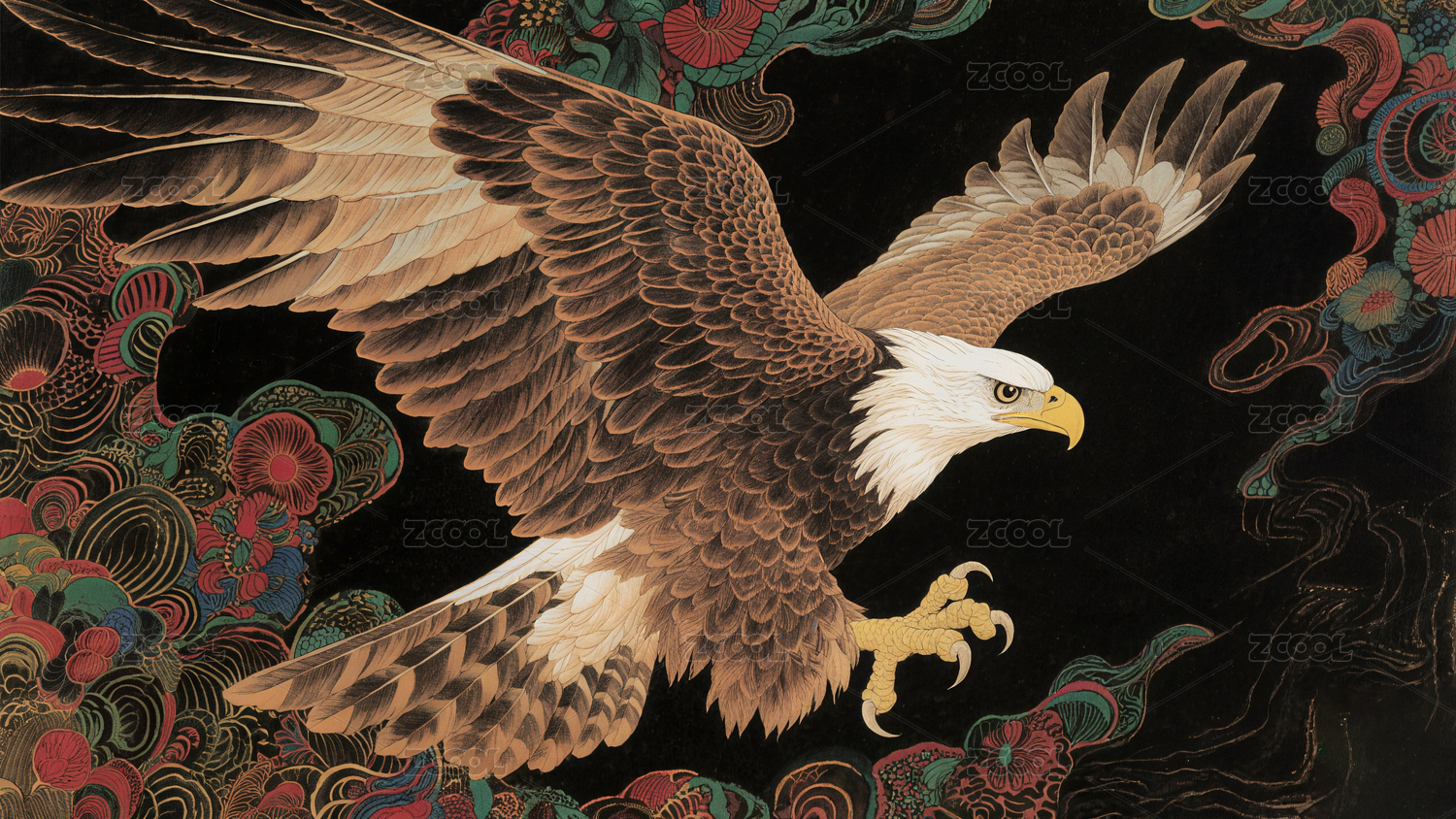 天空中飞翔的白头鹰,日本浮世绘艺术插画