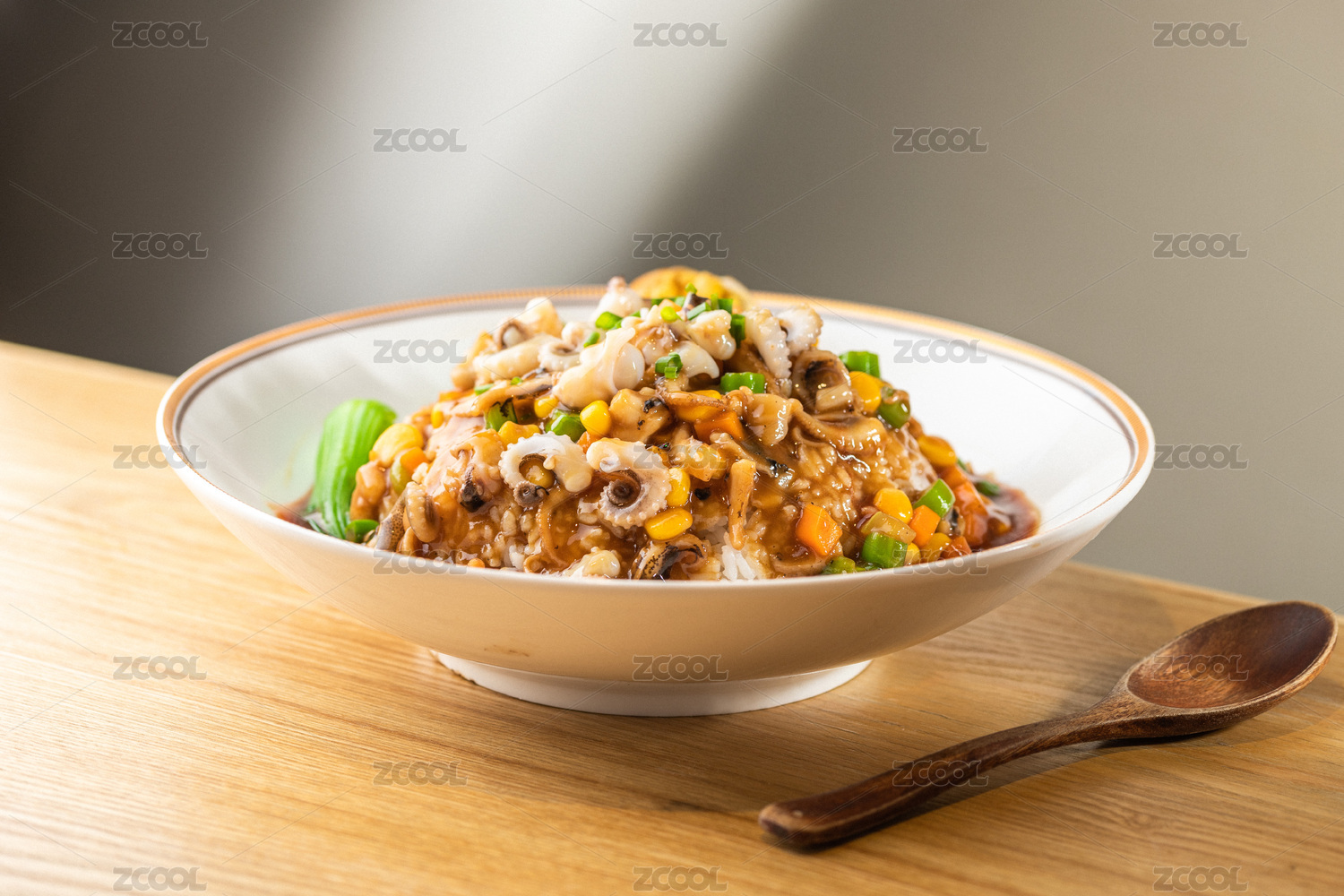 木纹桌面上放着一盘八爪鱼肉碎捞饭