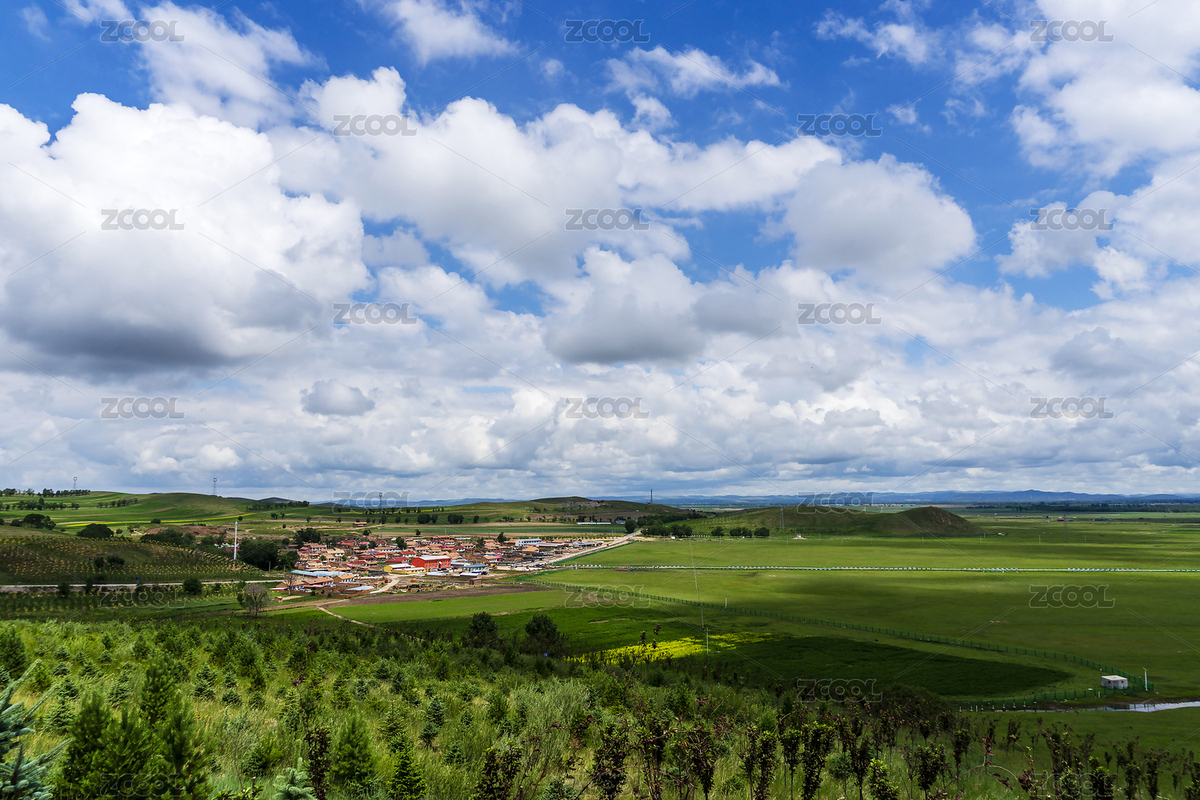 河北省沽源夏季蓝天白云下田野中的小镇