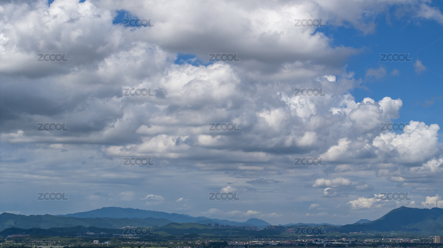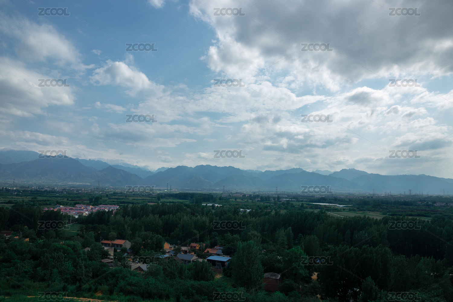蓝天白云映衬下的住宅楼群及路边的树木美景,中国北京昌平