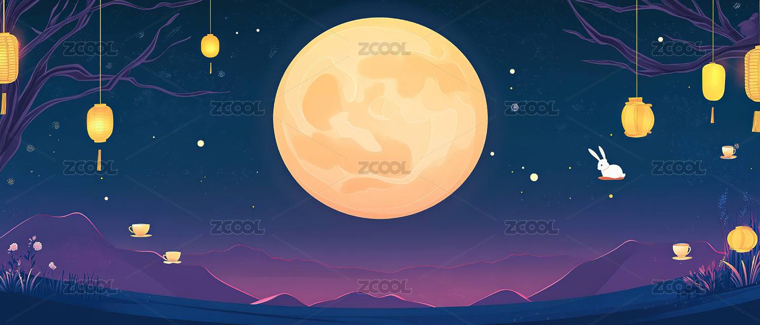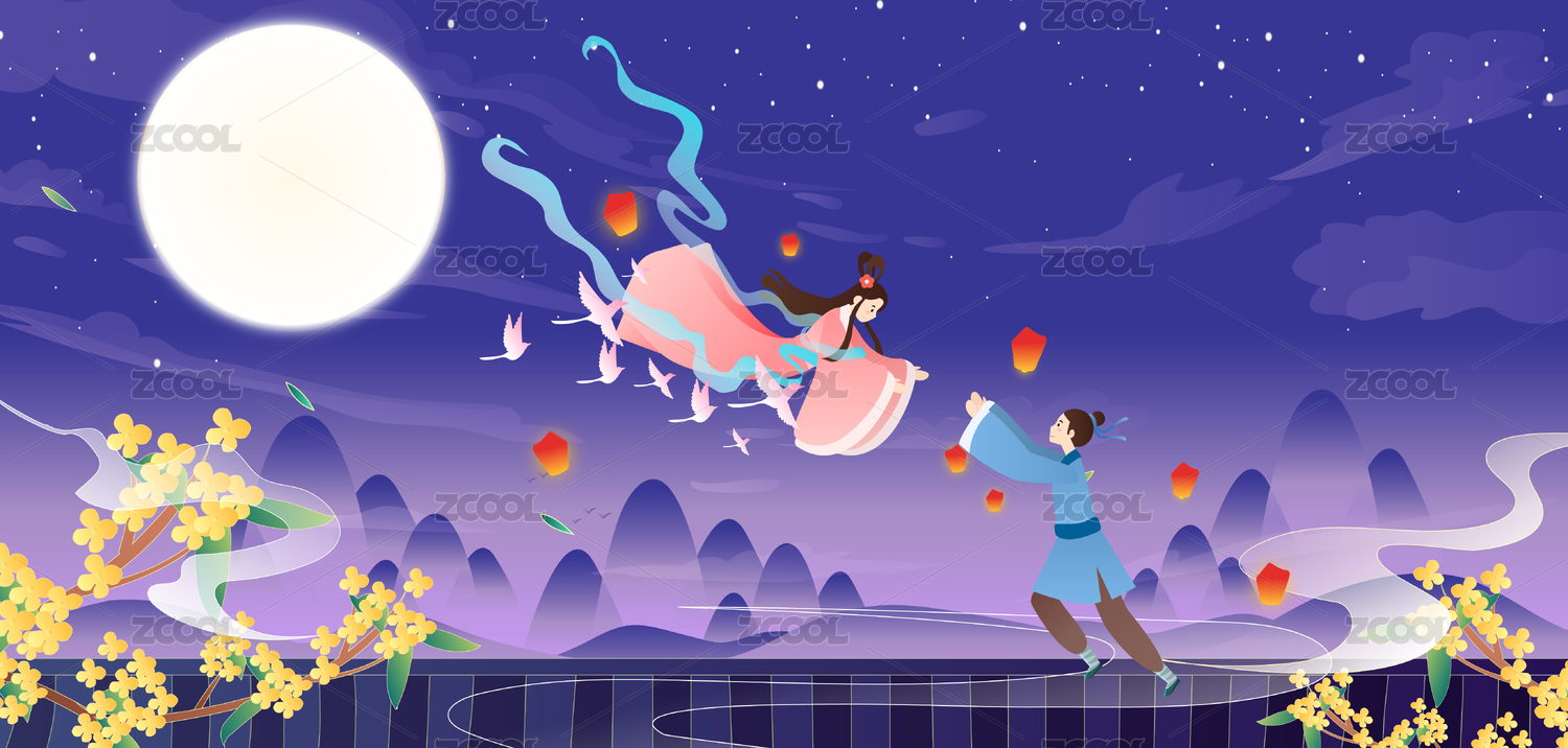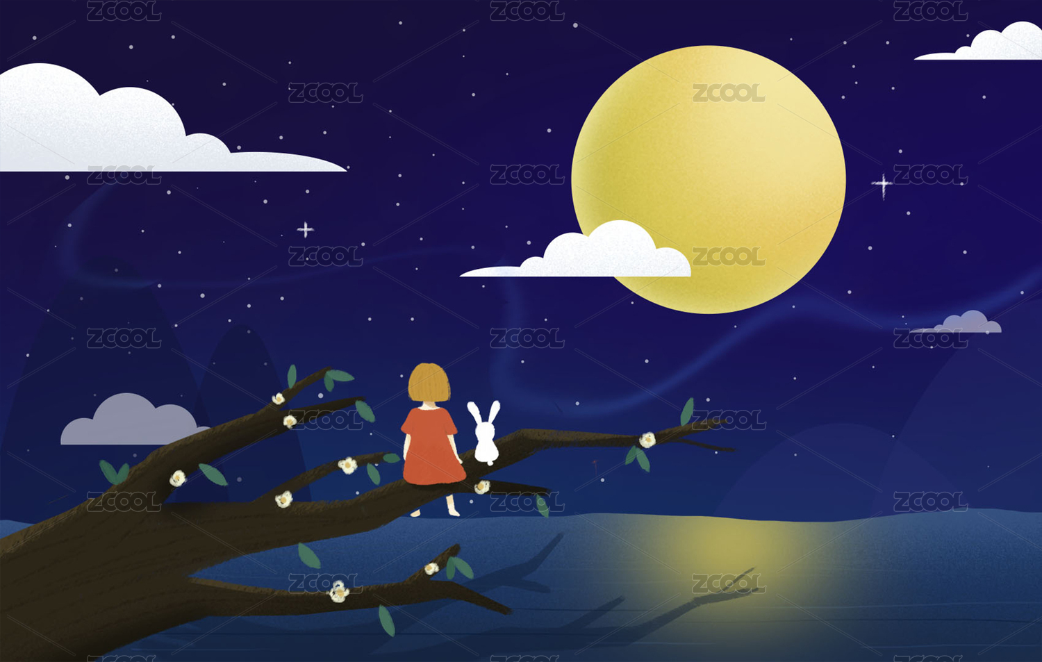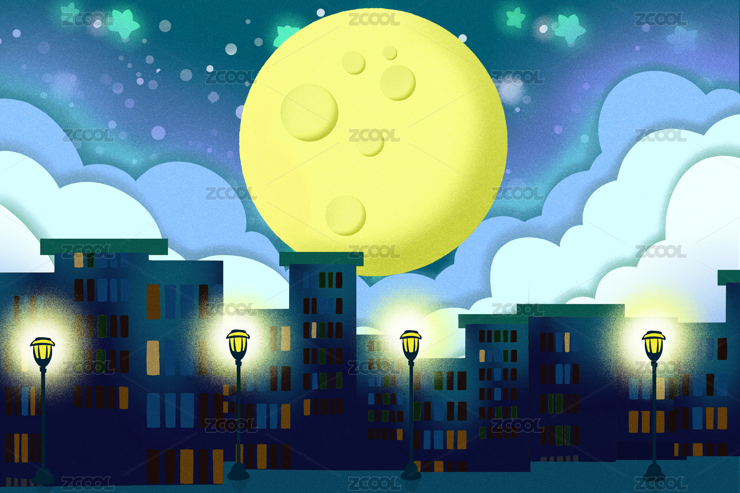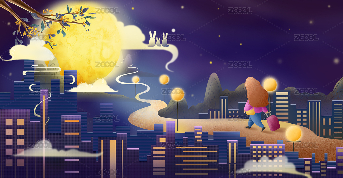 插画,城市,星空,HECMAF2020,中秋节,中秋,月亮,桂花,扁平风,玉兔