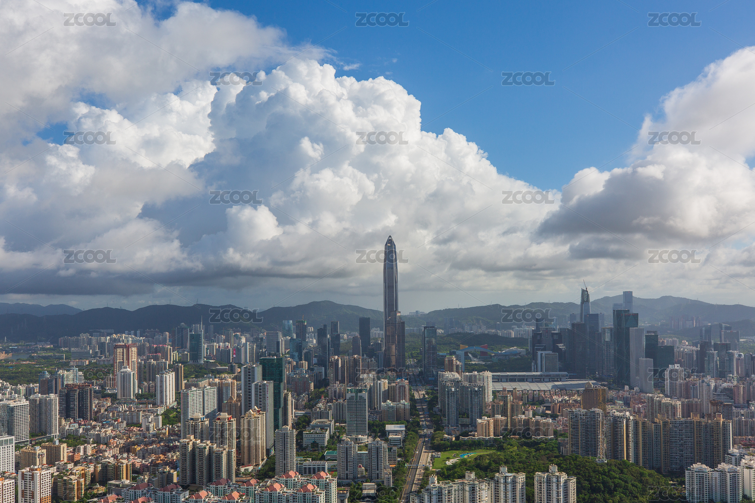 蓝天白云白天的深圳市中心福田中心天安高尔夫球场