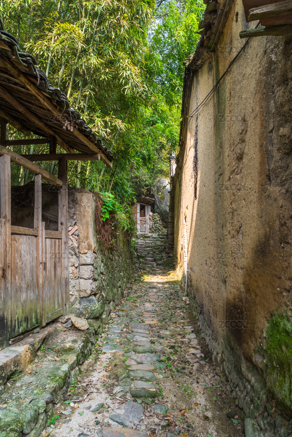 挂有灯笼的木屋下一条石砌的小路,中国福建长汀