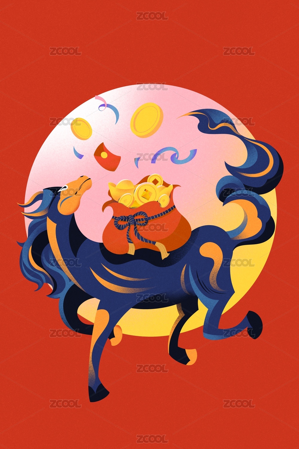 新春牛角勾住铜钱春字造型的牛年生肖插画