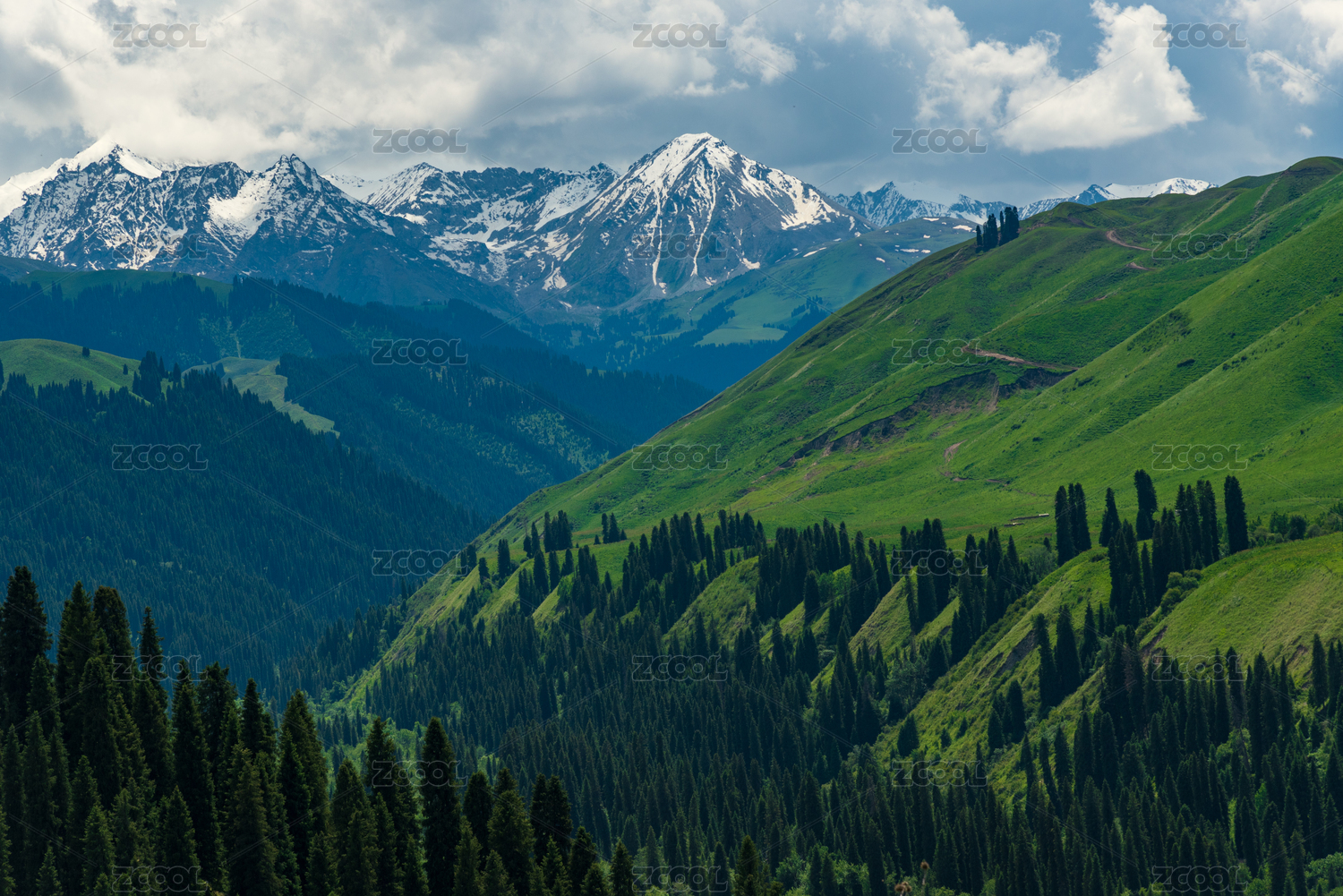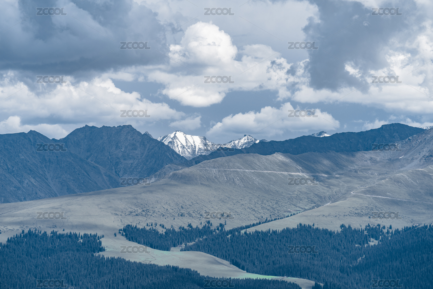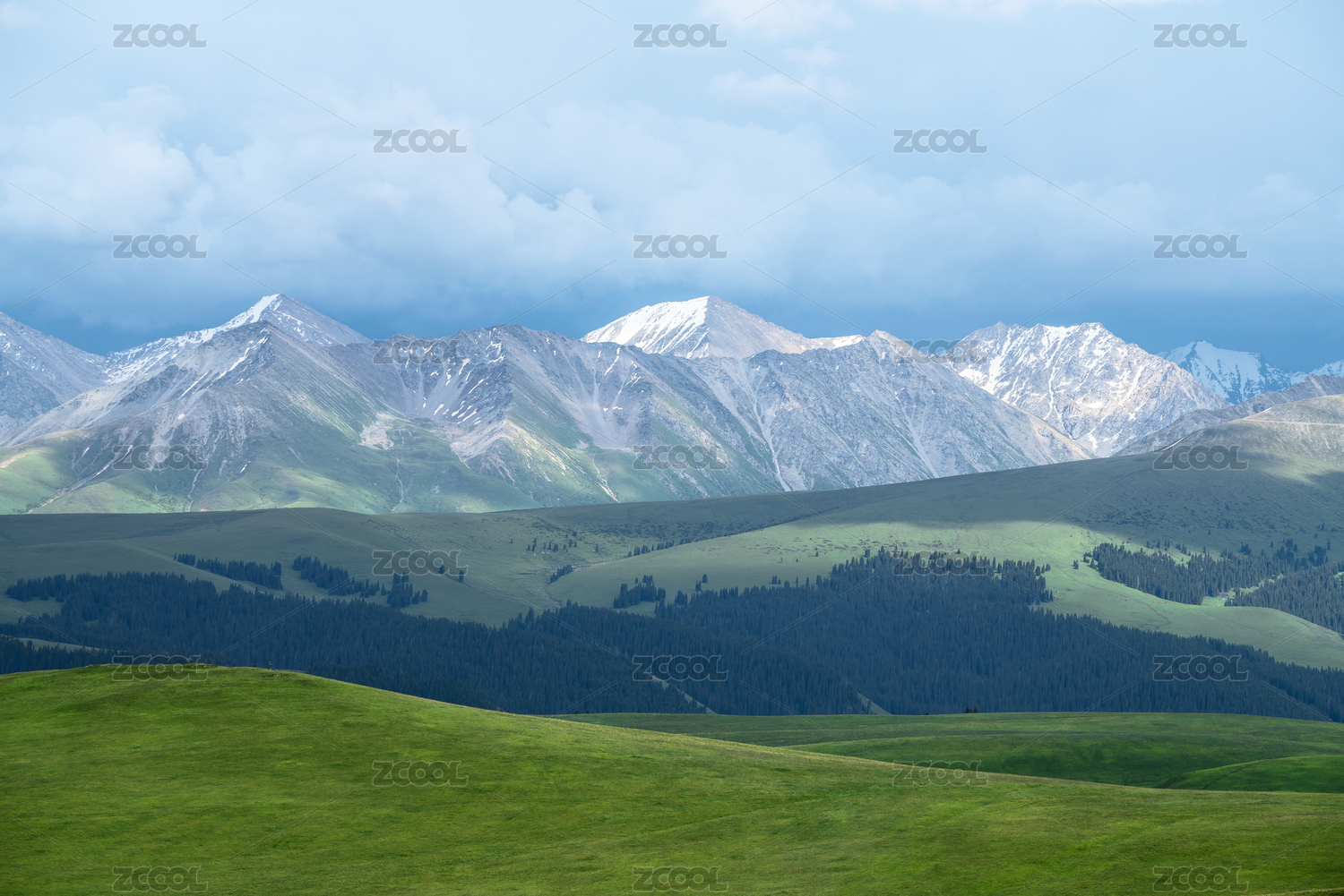 晴天下的中国新疆伊犁独库公路雪山草原风景
