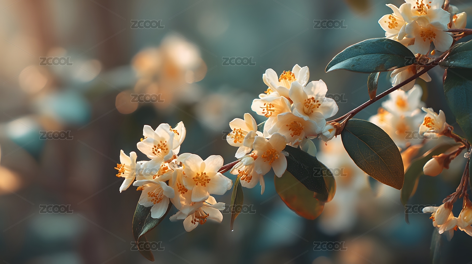 花枝繁茂绽放,柔和光线唯美意境