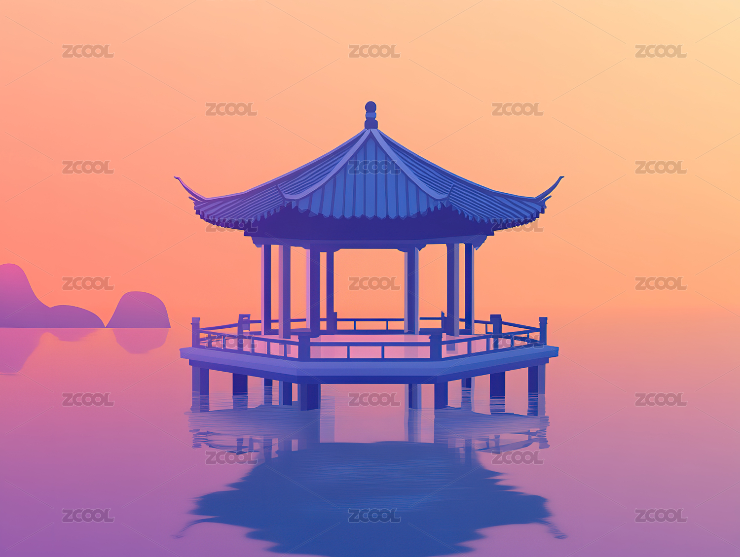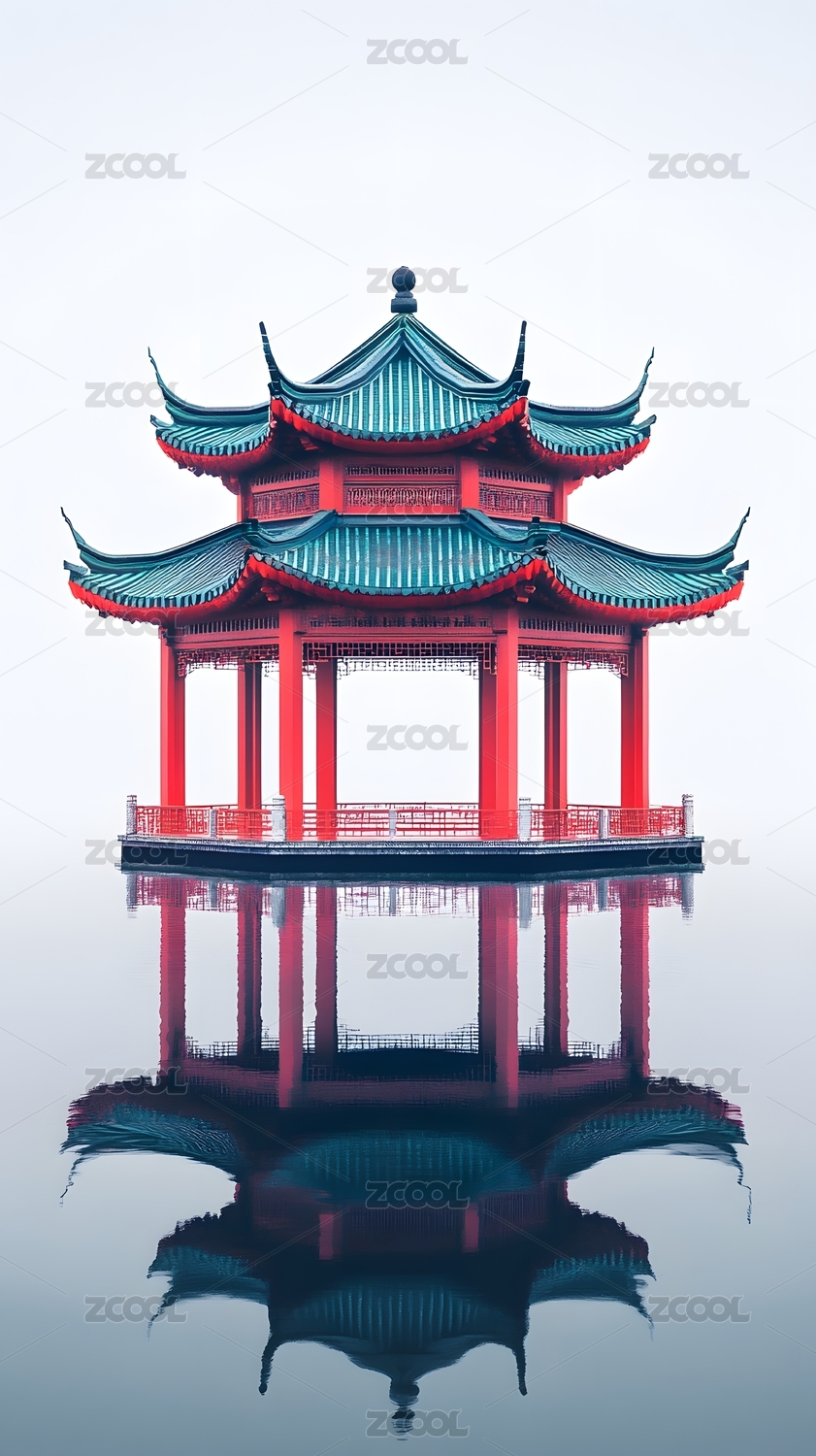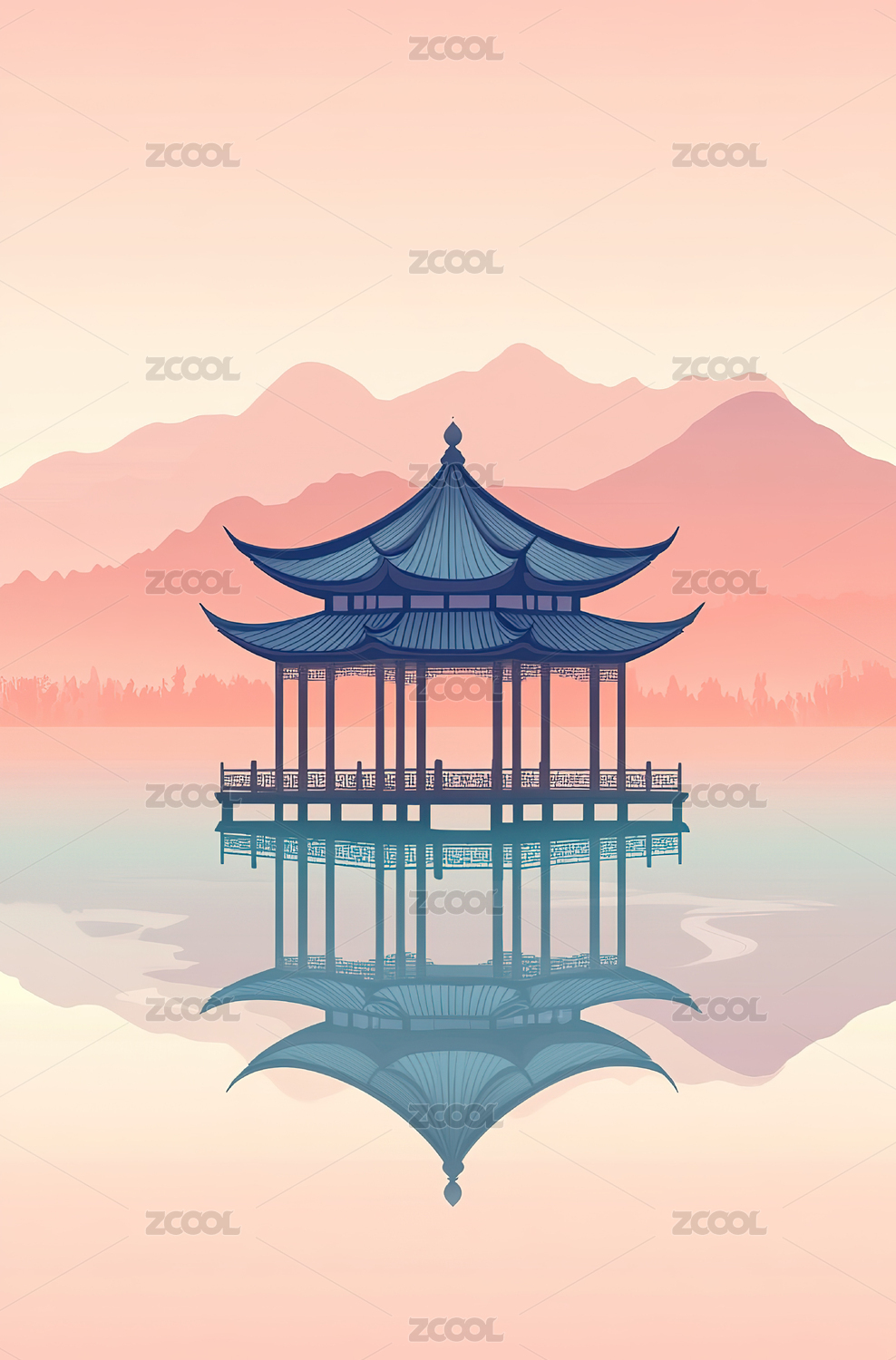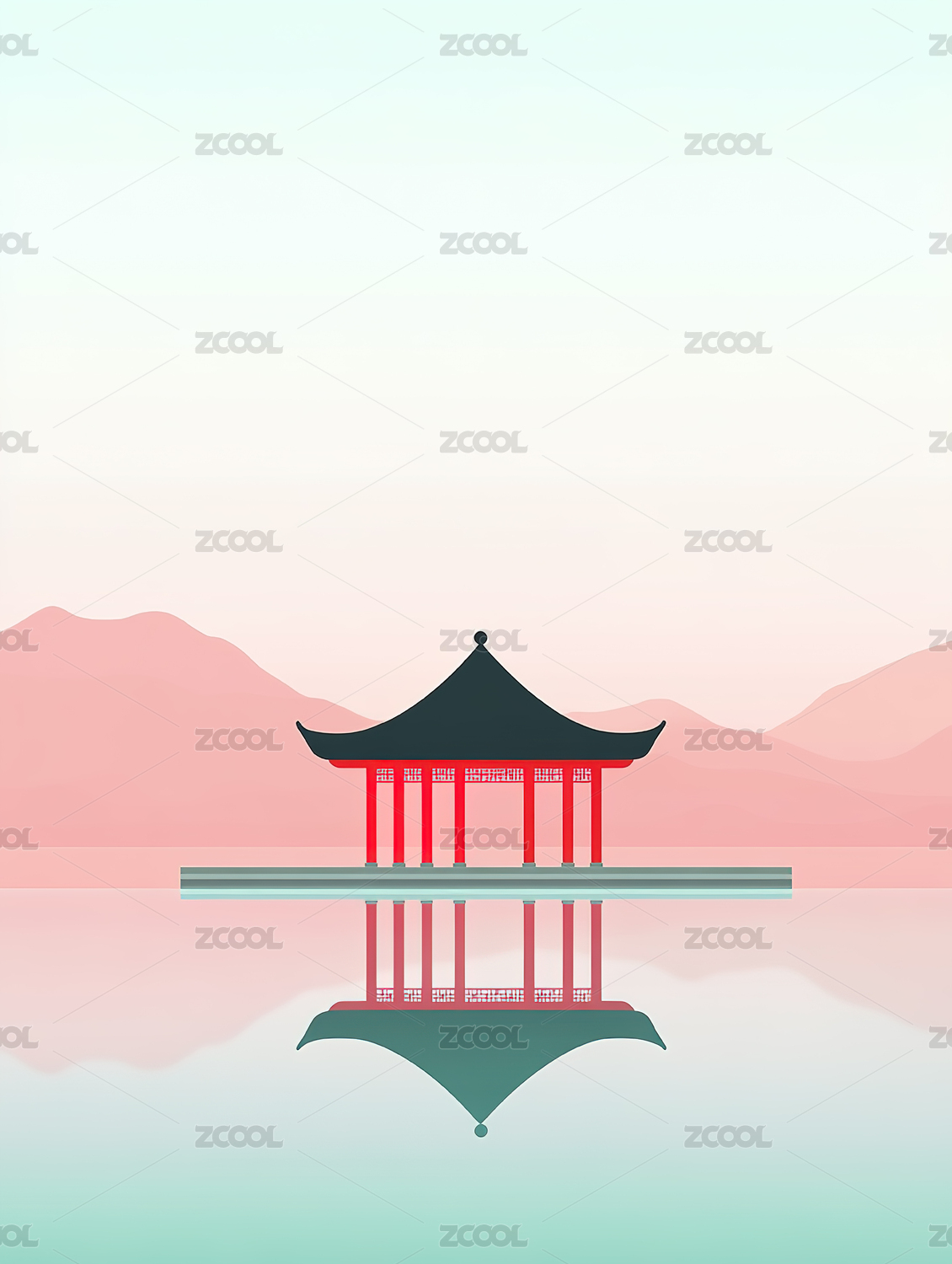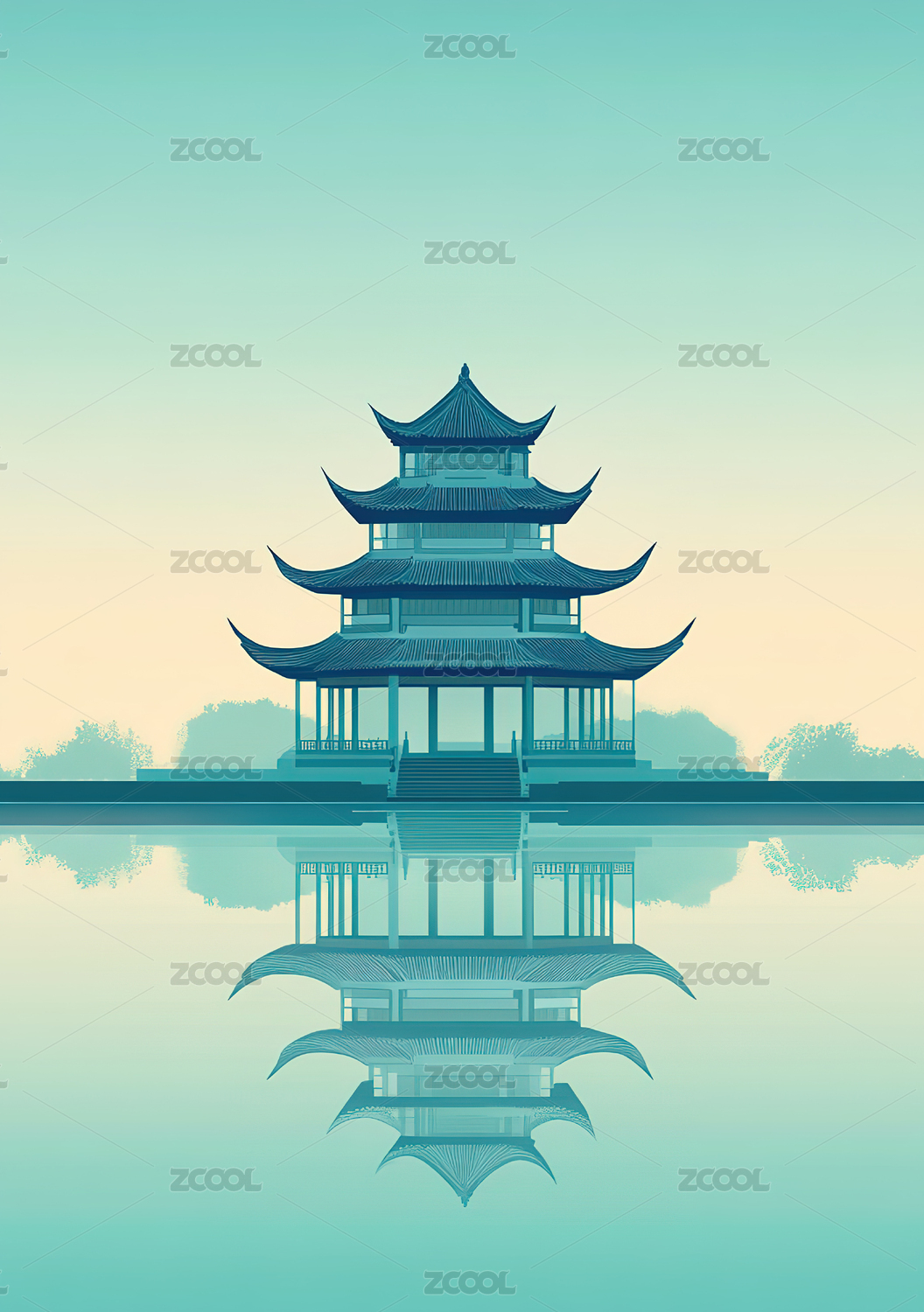中国风,亭台楼阁,水景,倒影,建筑,中式建筑,景观,简约,现代,抽象