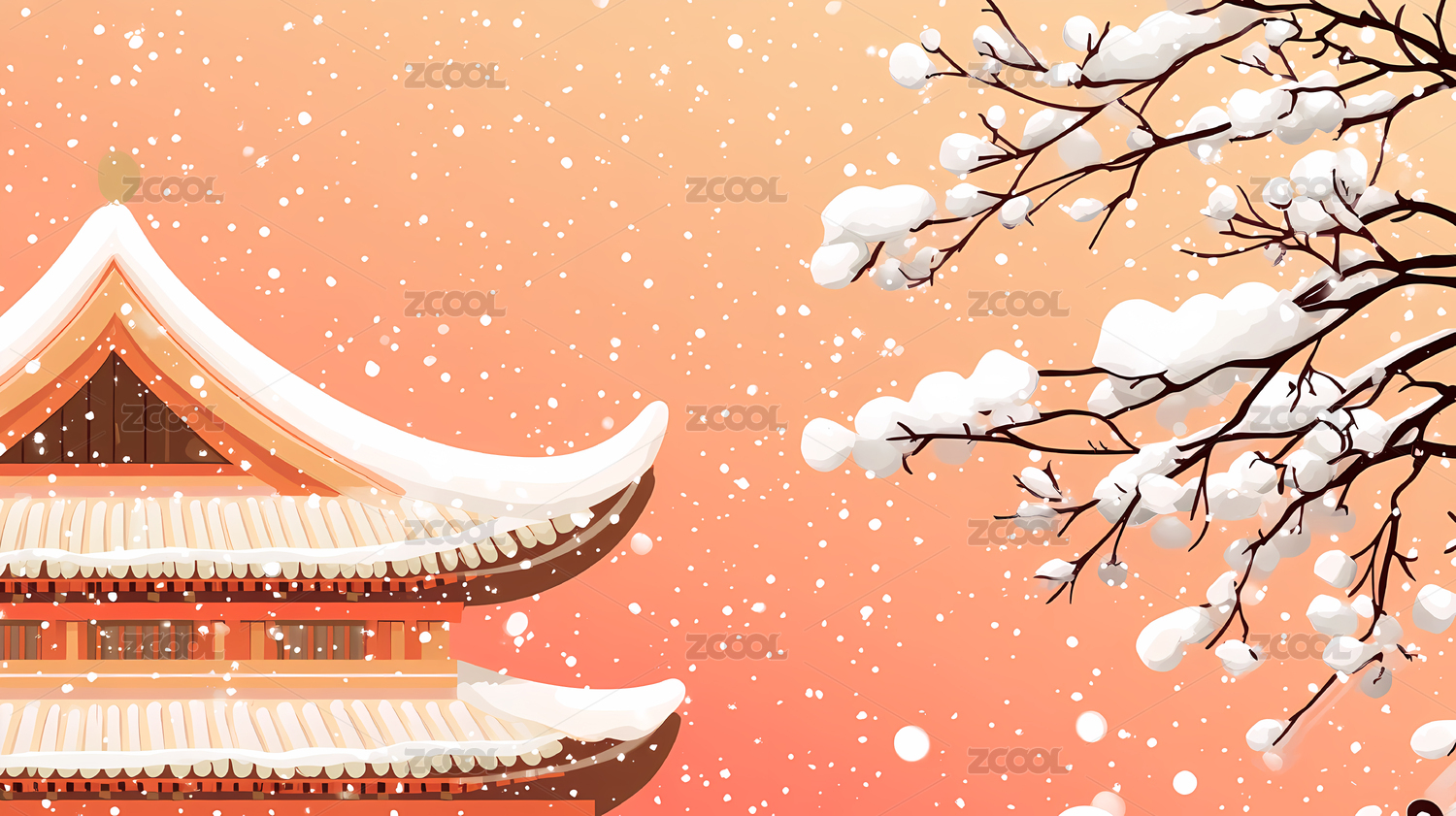 中式古建筑国风冬季雪景插画