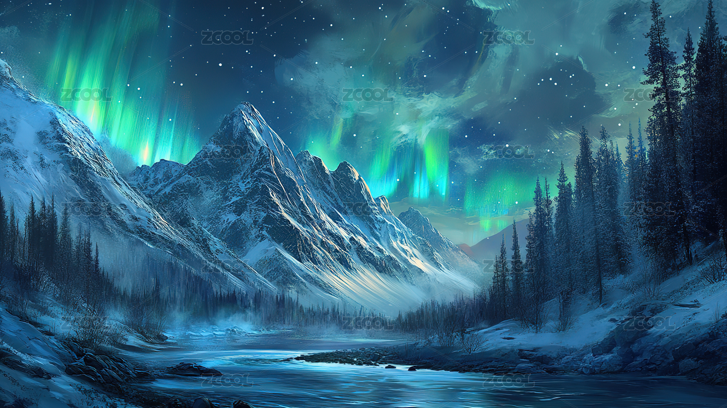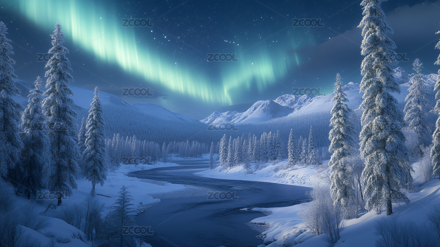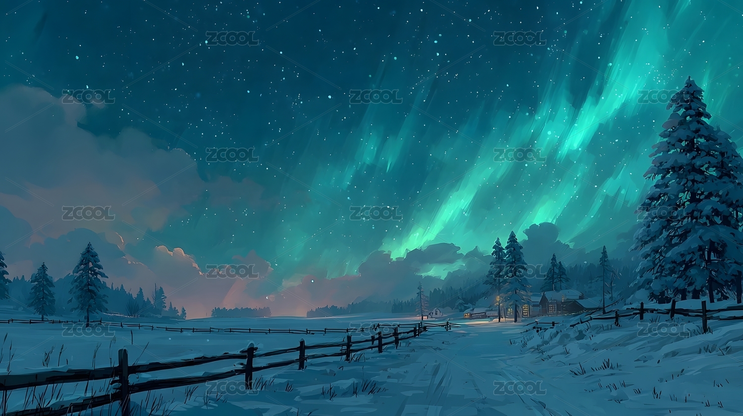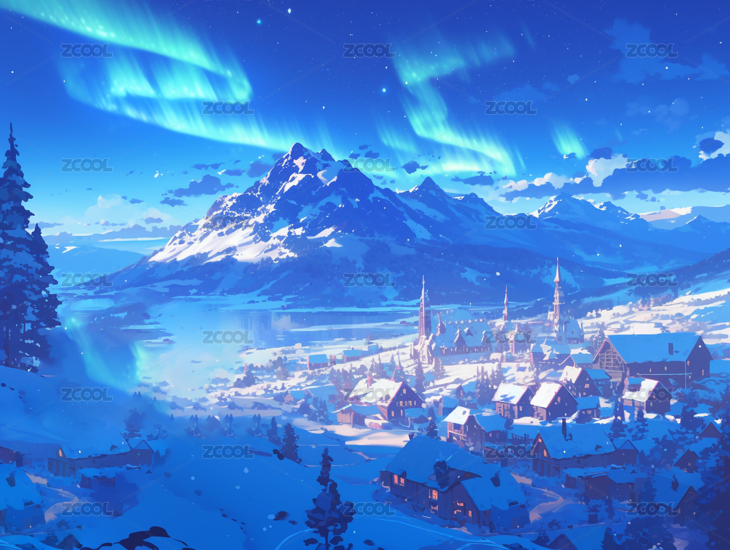 雪山,村落,乡村,极光,夜景,宁静,自然,美景,雪景,星空