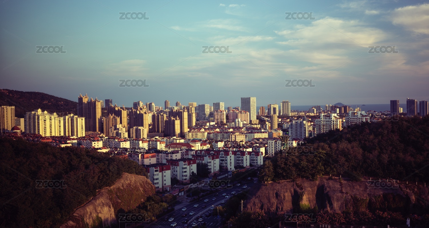 航拍山东烟台沿海海岸线建筑群城市自然风光