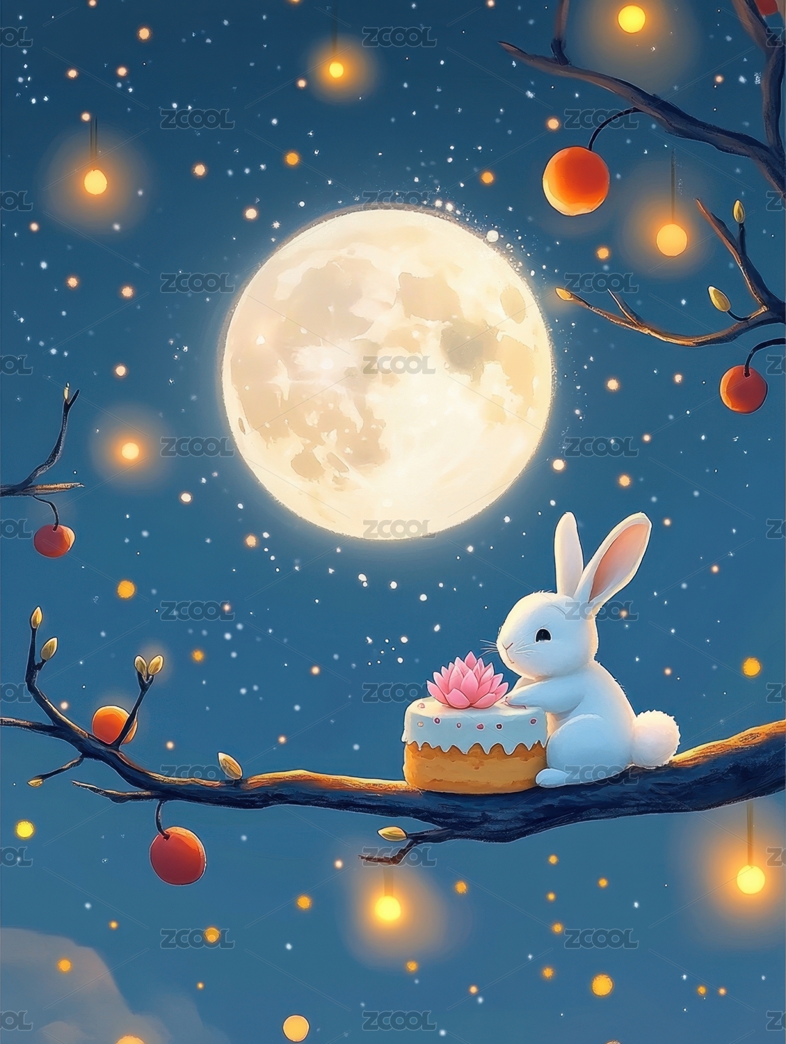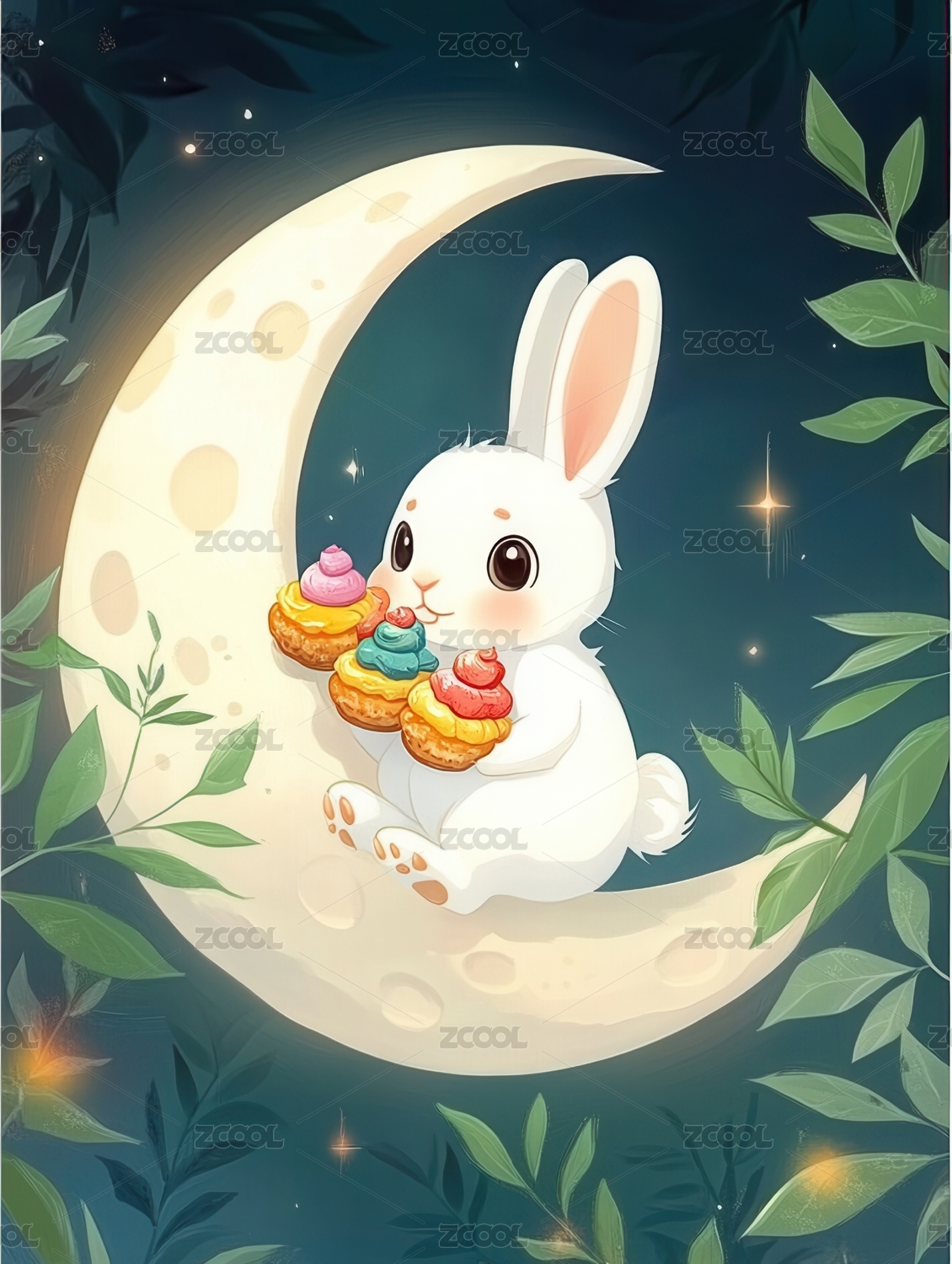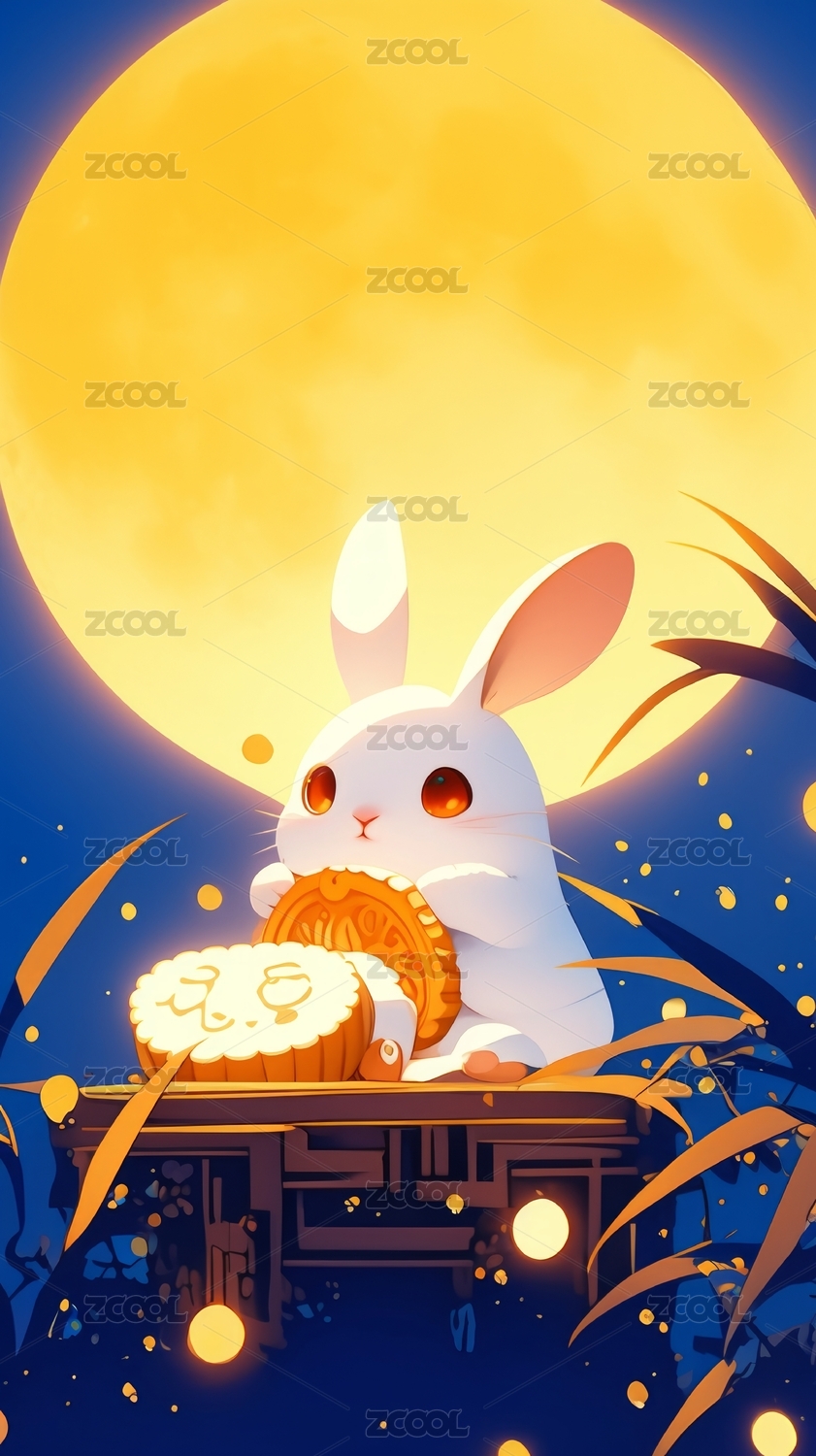 中秋节月亮玉兔抱着月饼赏月场景概念插图