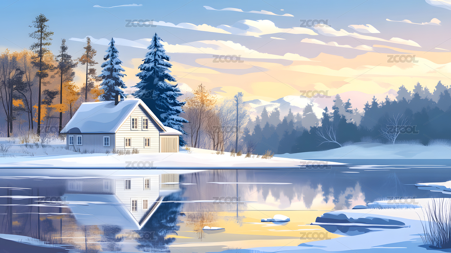 雪中的湖边小屋