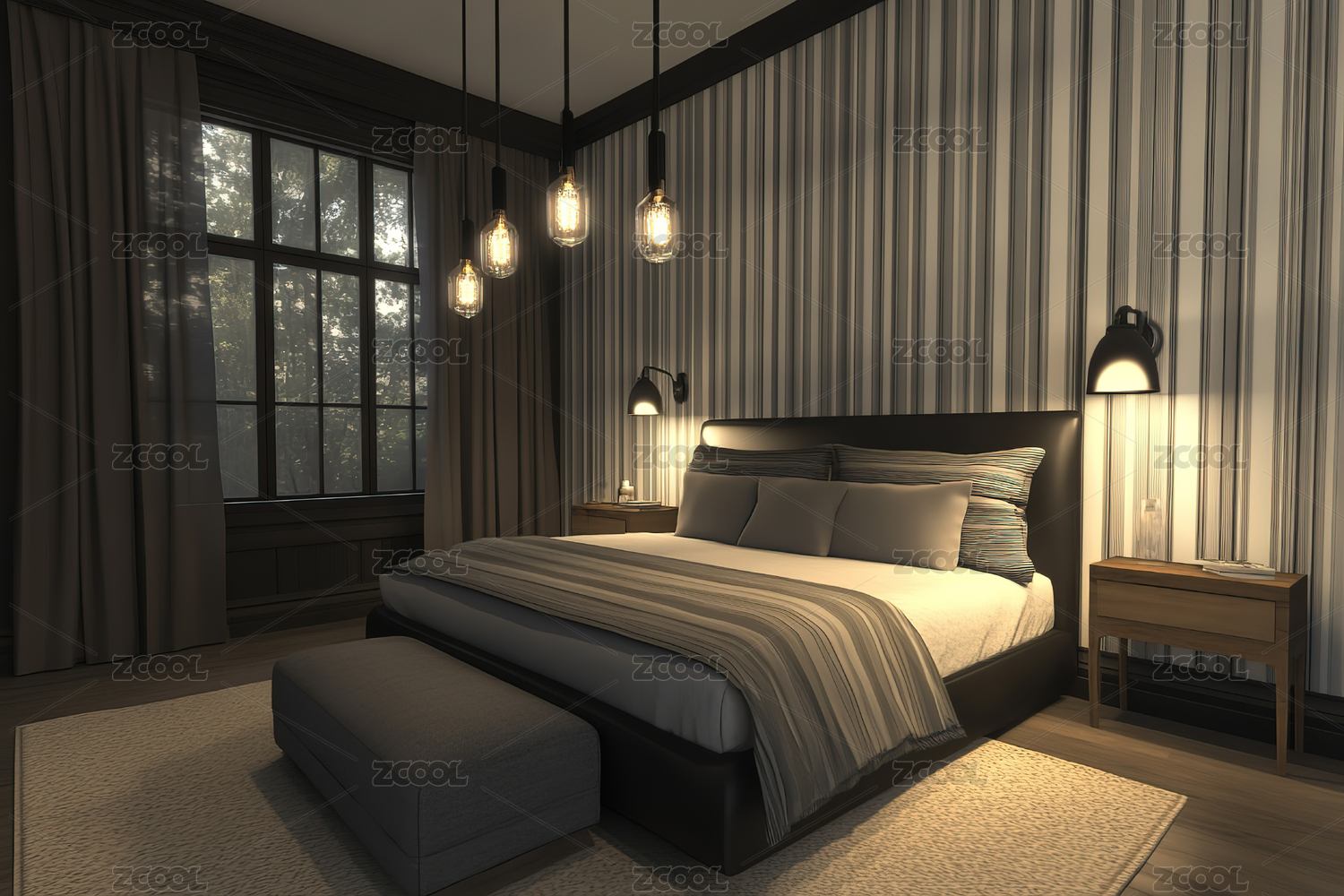 现代, 室内设计, 植物, 室内,卧室, 床, 床单, 枕头, 床头柜, 舒适