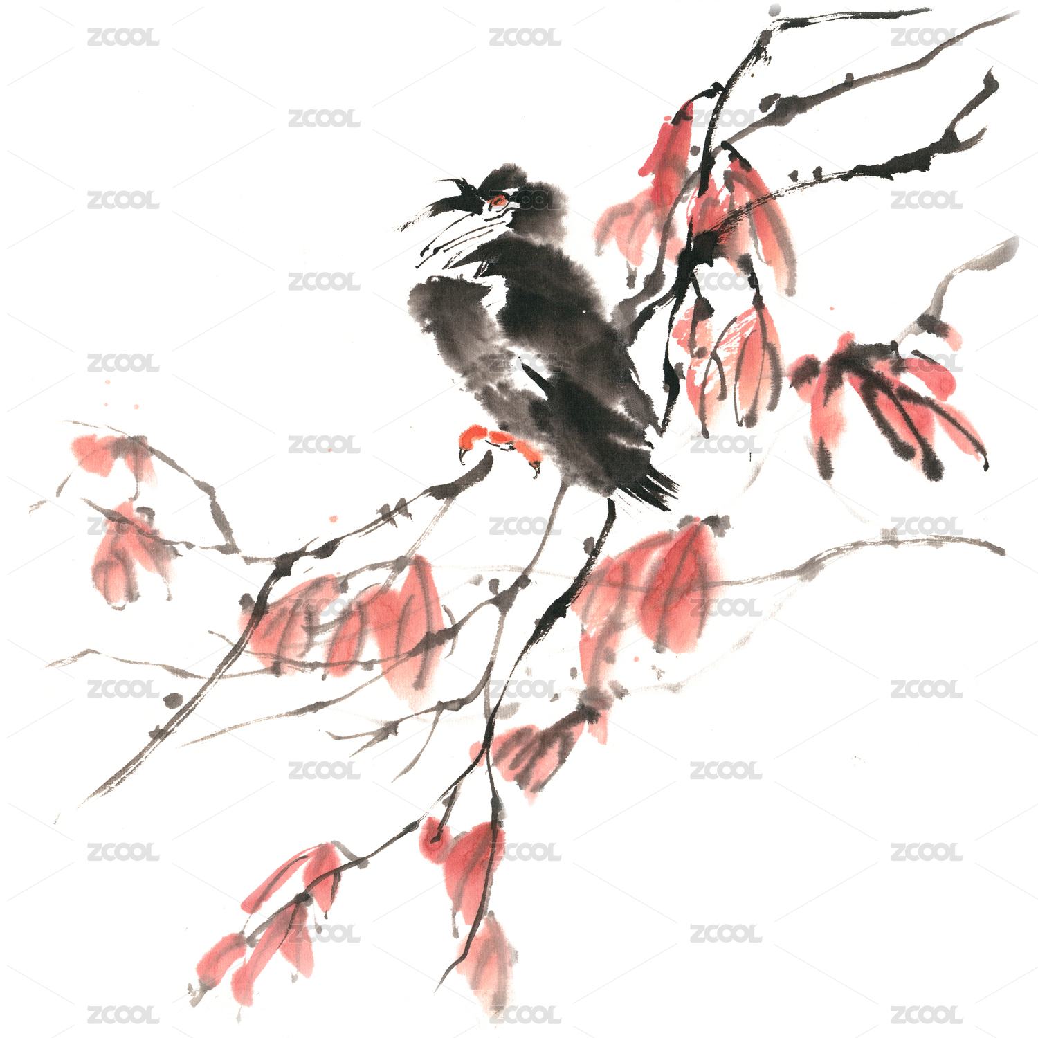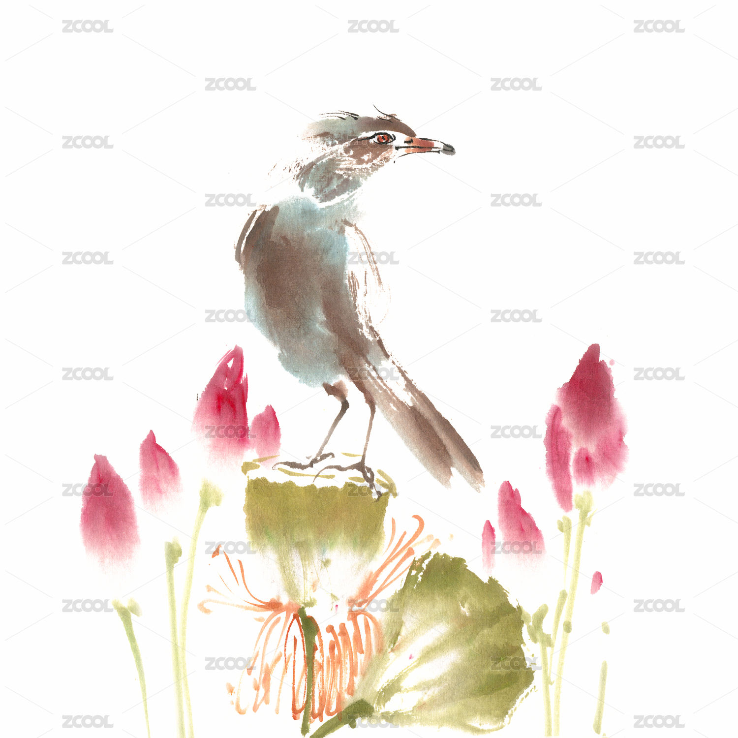 水墨画,玉兰花,小鸟,树枝,植物,回头,休憩